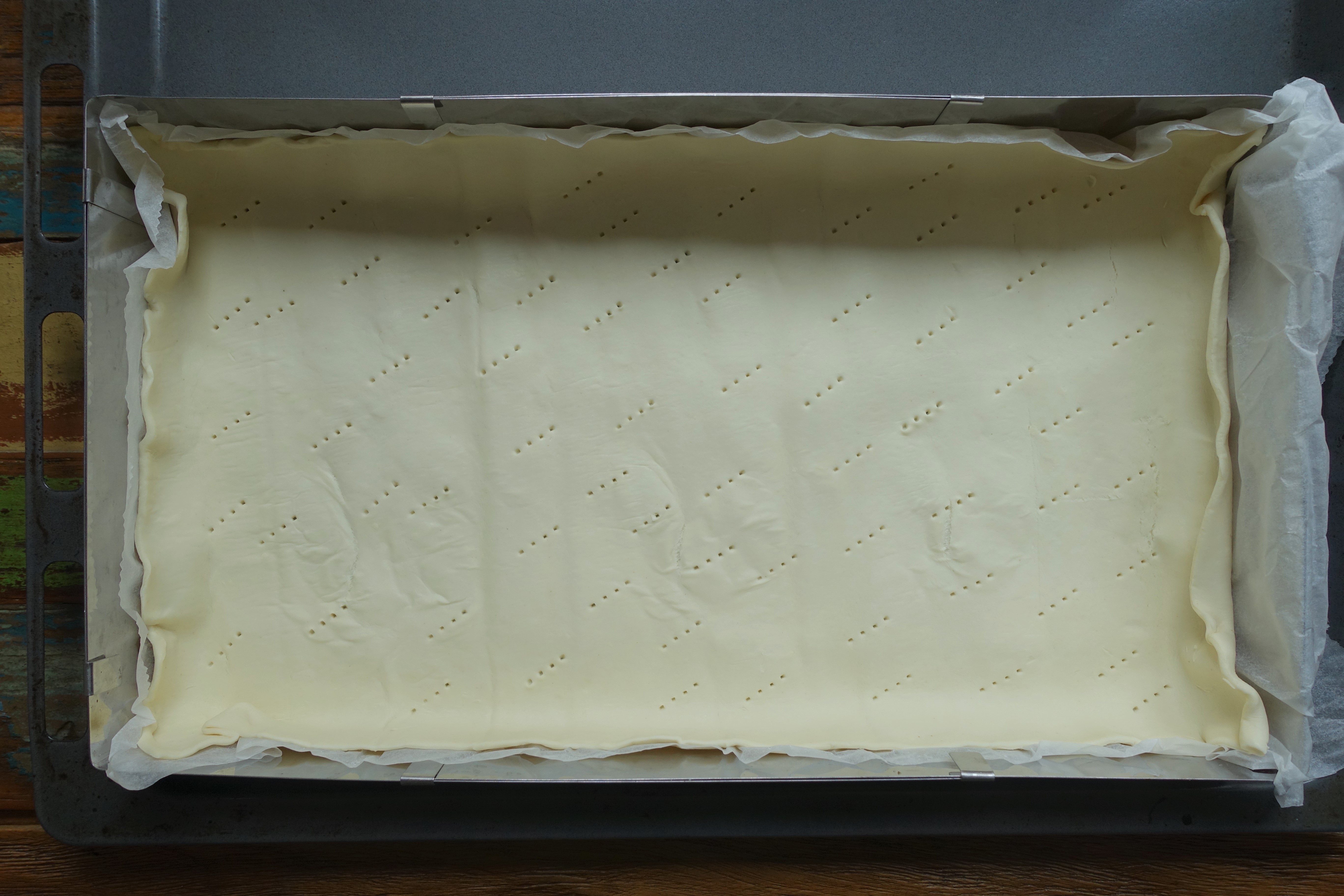 - 1 P. Blätterteig (auf Backpapier rechteckig ausgerollt)