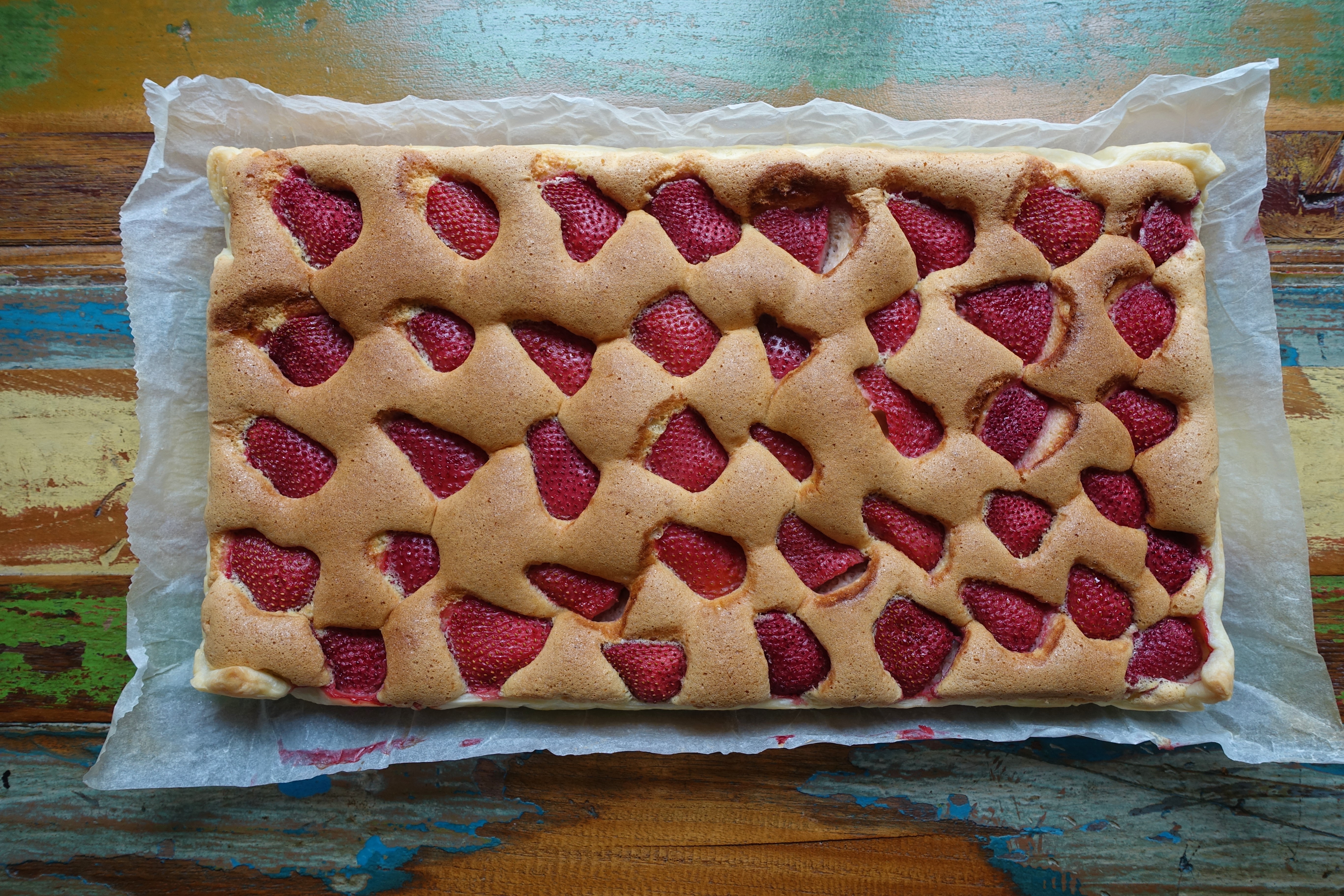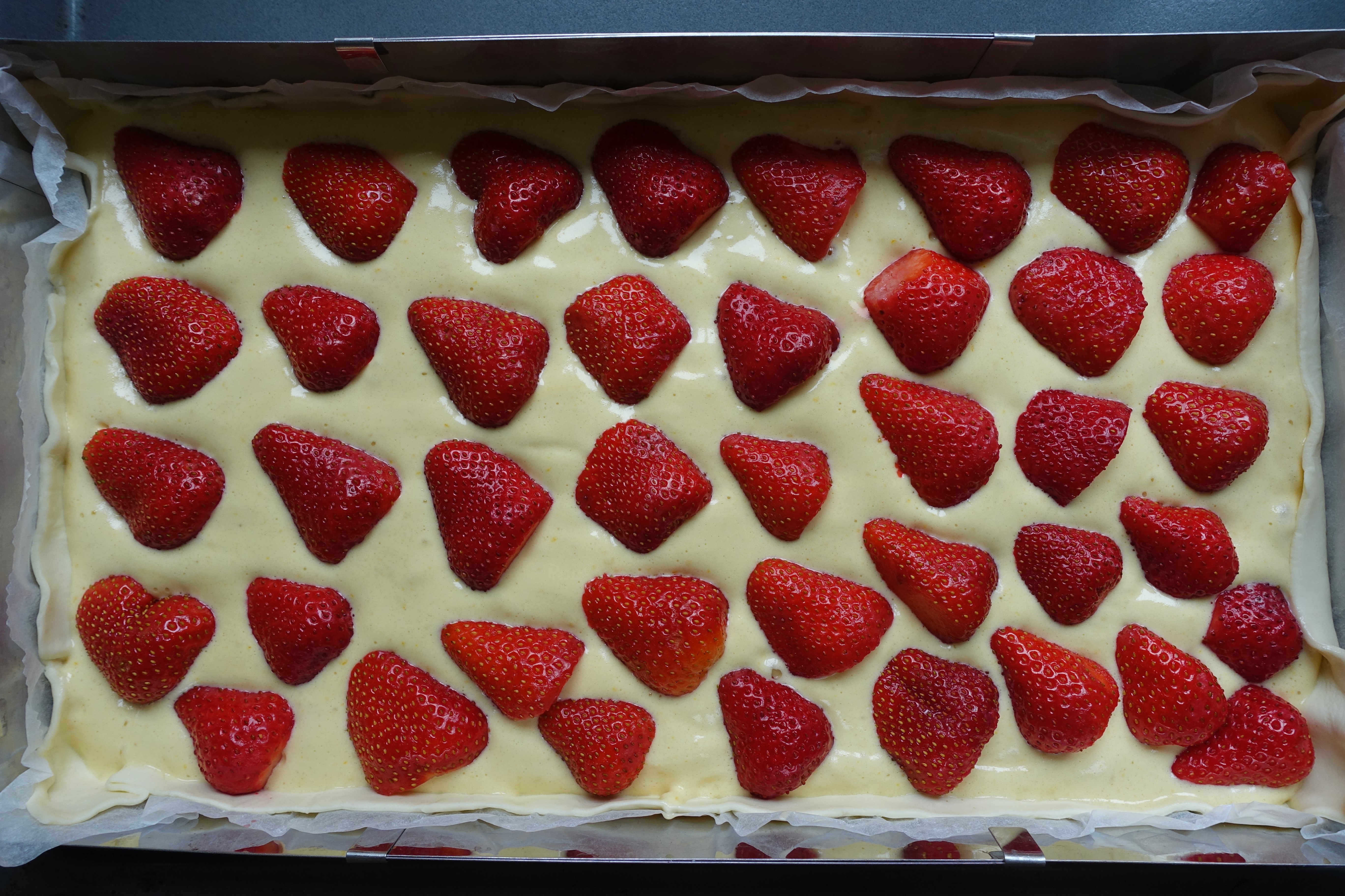 Den Backrahmen auf ein Backblech stellen. Den Blätterteig ausrollen, in den Rahmen legen und einen Rand formen. Den Boden des Teiges mit einer Gabel mehrmals einstechen, den Biskuitteig einfüllen und glatt streichen. Die Erdbeeren waschen, trocken tupfen und halbieren. Mit der Schnittstelle nach unten auf den Biskuitteig setzen.