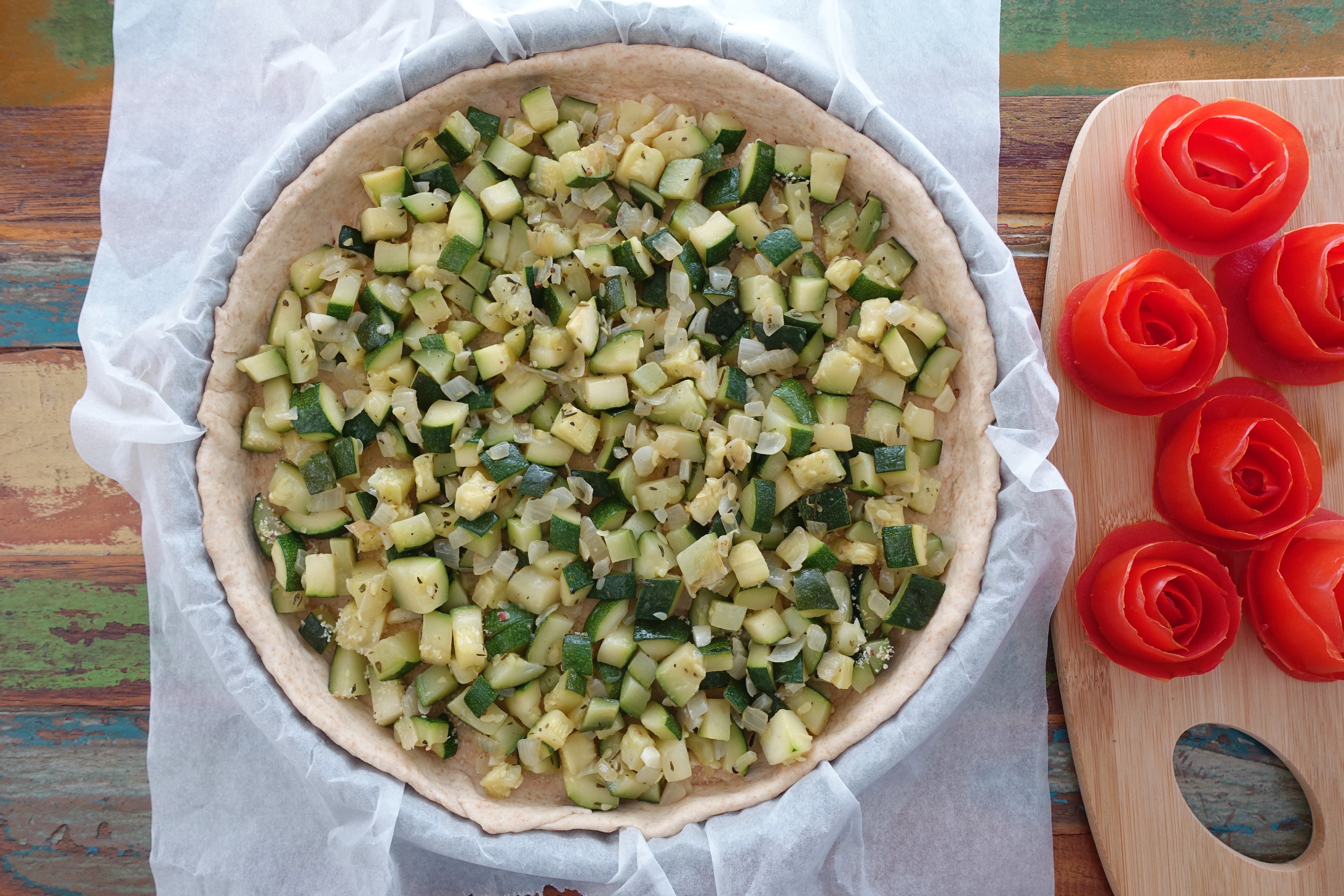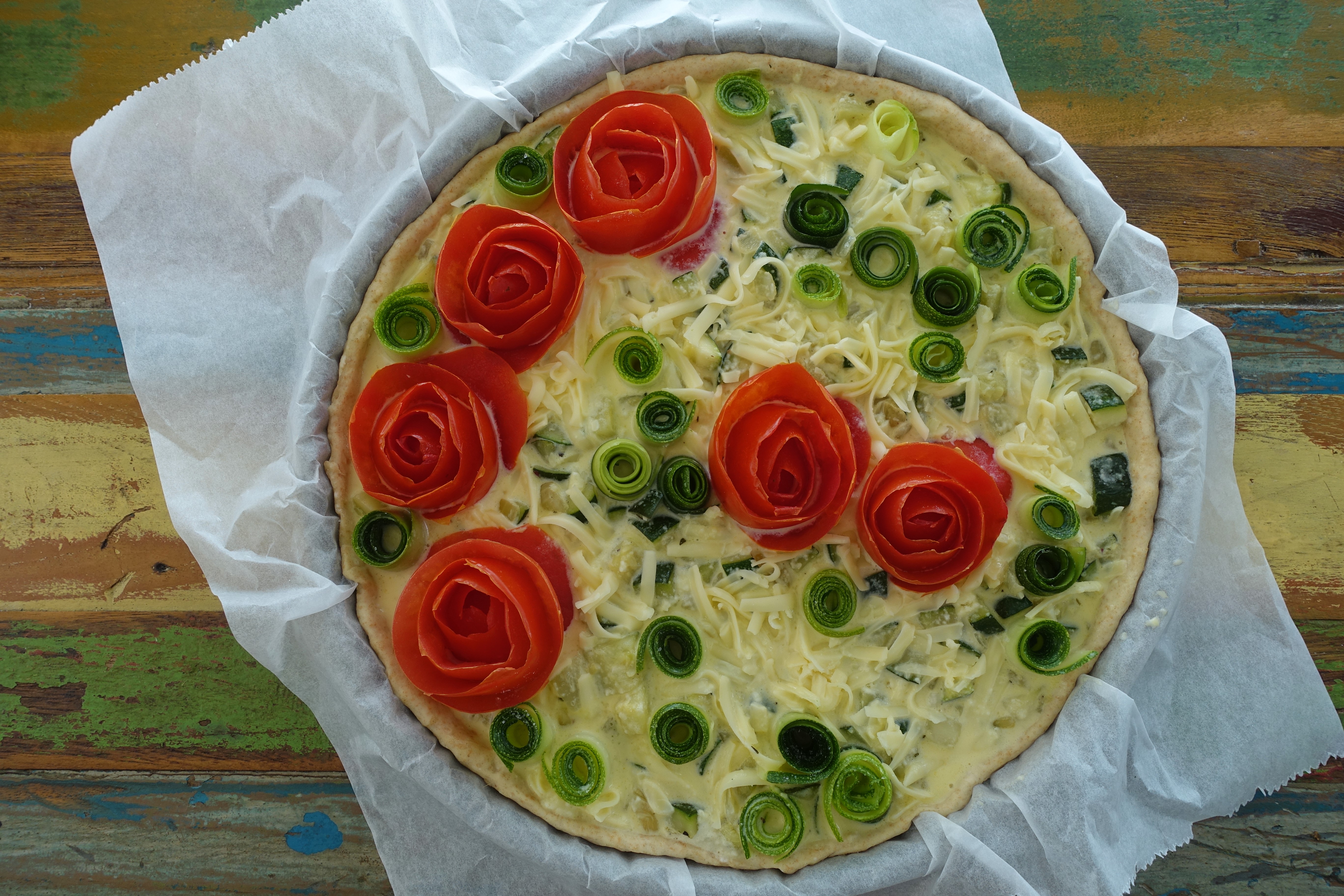 Den Teig auf Backpapier kreisrund ausrollen (etwas größer als die Form). Teig samt Backpapier in die Form legen und einen Rand formen. Den Boden mit einer Gabel mehrmals einstechen und mit den Semmelbröseln bestreuen. Die Zucchiniwürfel darauf verteilen. Schlagobers mit Eiern, Muskatnuss, Parmesan und etwas Salz verquirlen und über den Belag gießen. Den grob gehobelten Käse (Gouda) darüber streuen. Dann die Tomaten-Röschen sowie die Zucchiniröllchen daraufsetzen und etwas salzen.