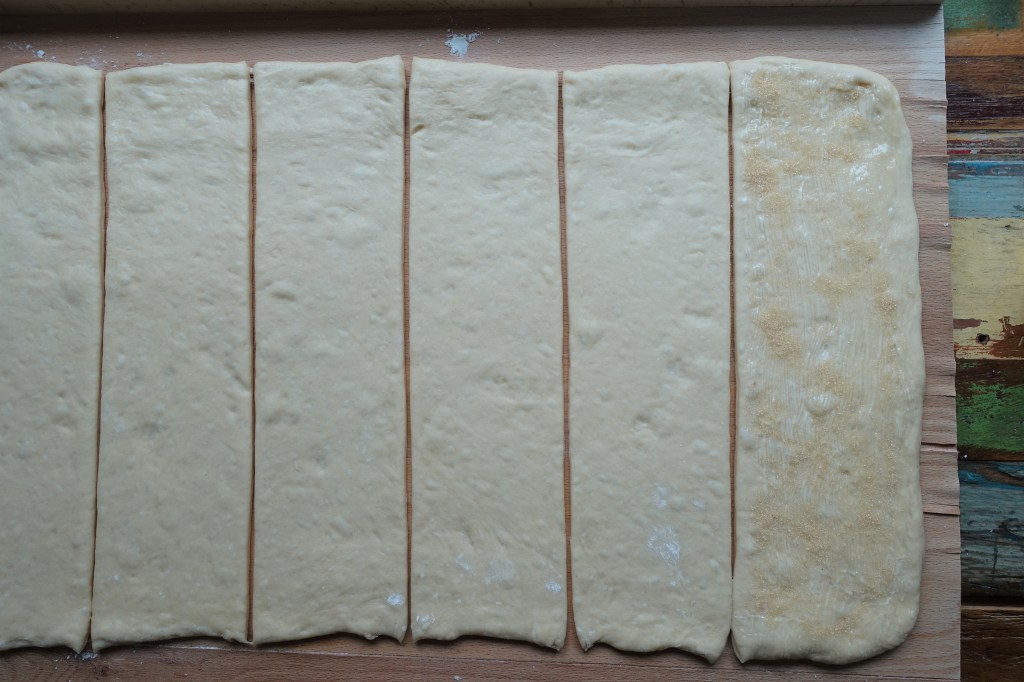 Danach den Teig auf einer leicht bemehlten Arbeitsfläche zu einem großen Rechteck ausrollen. Den Teig anschließend in 6 gleich große Streifen schneiden. 5 davon mit Butter bestreichen, mit etwas Rohrzucker bestreuen …
