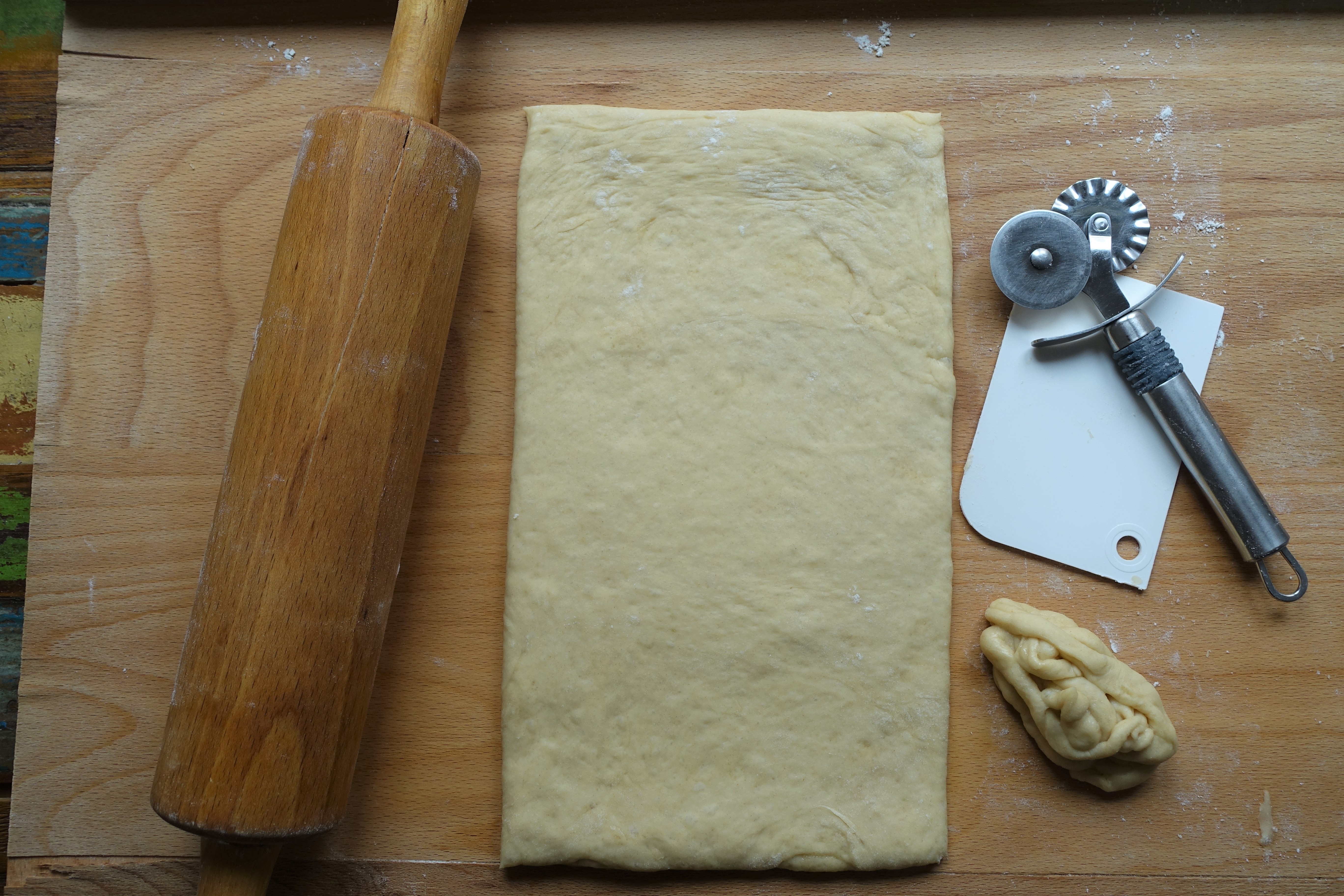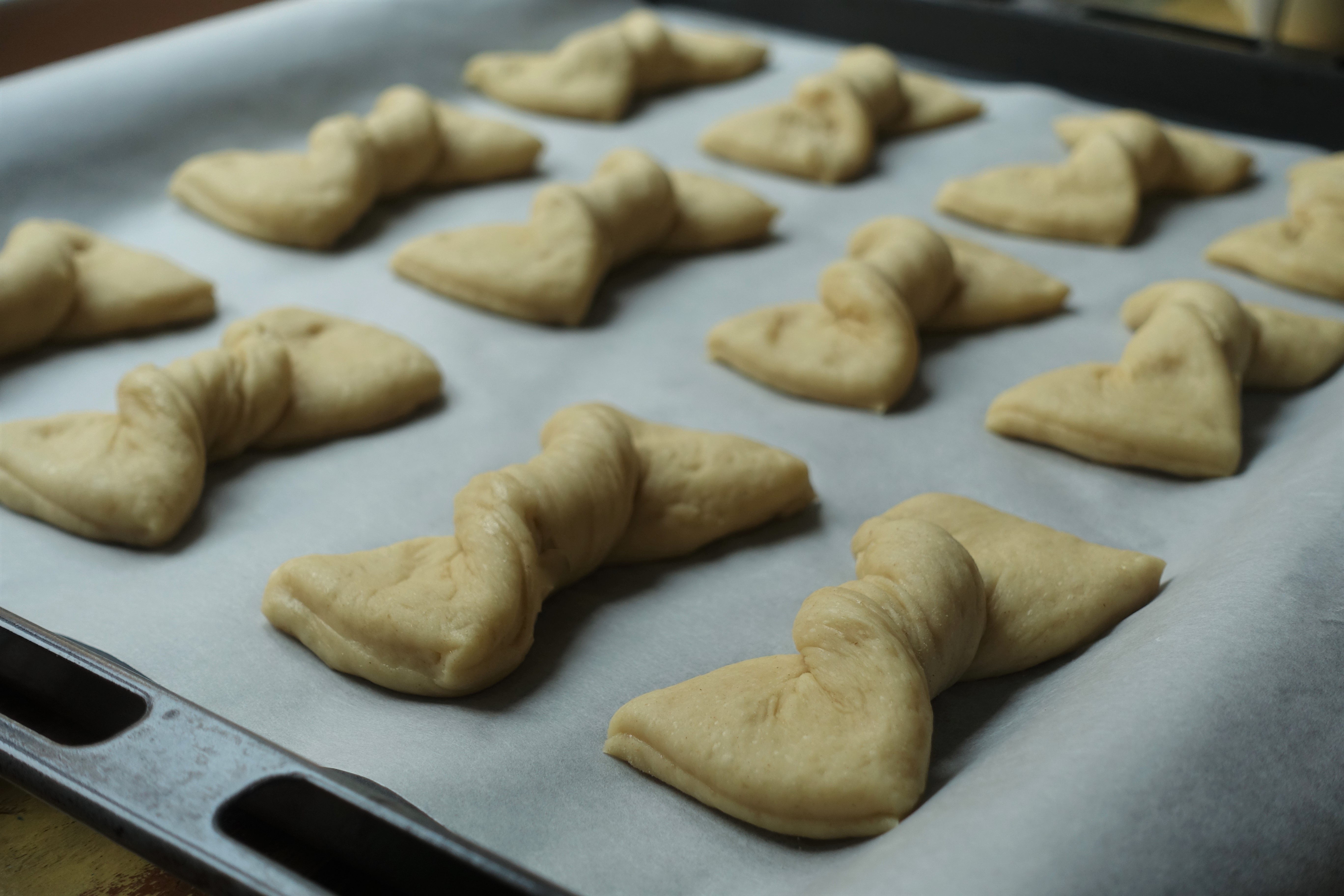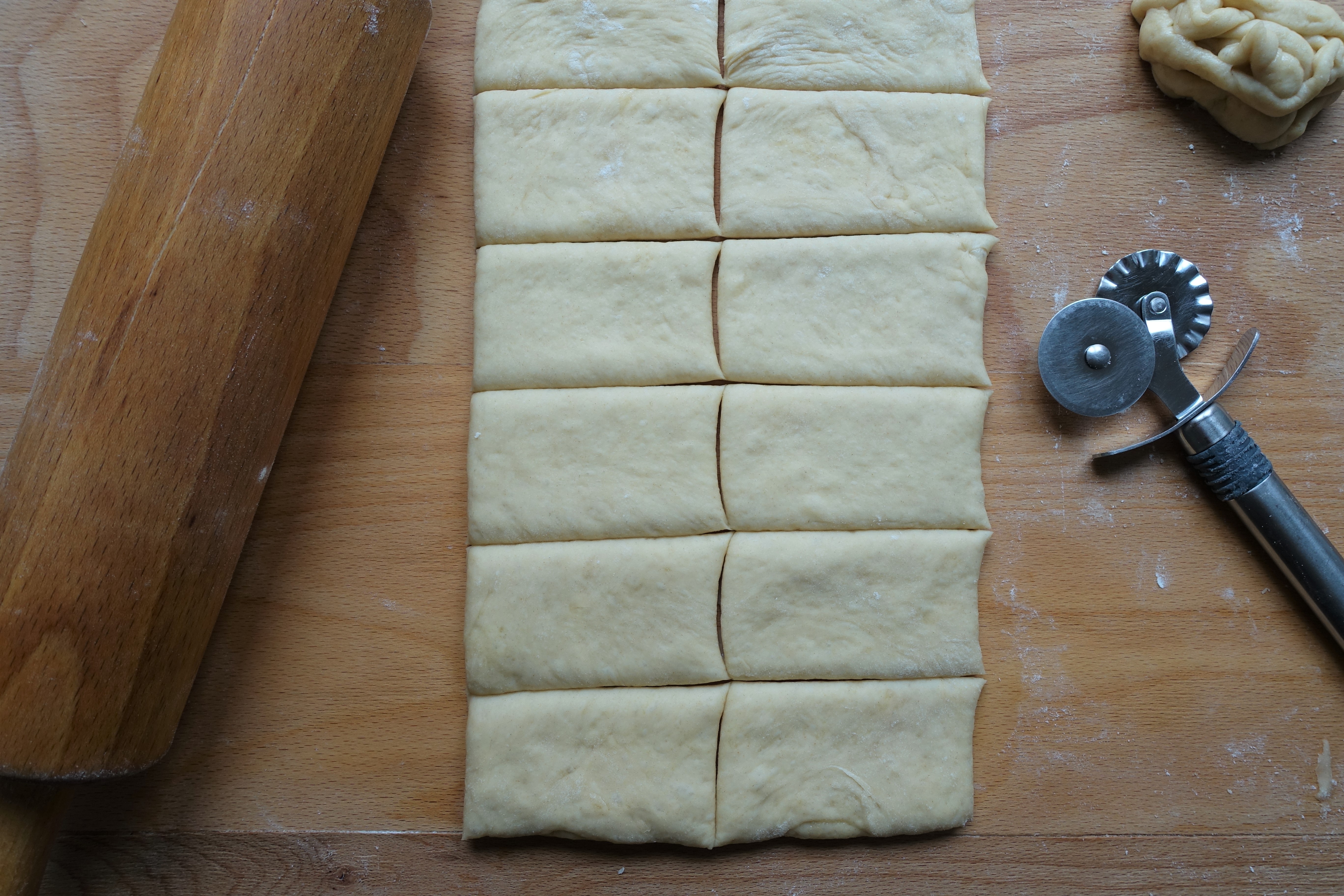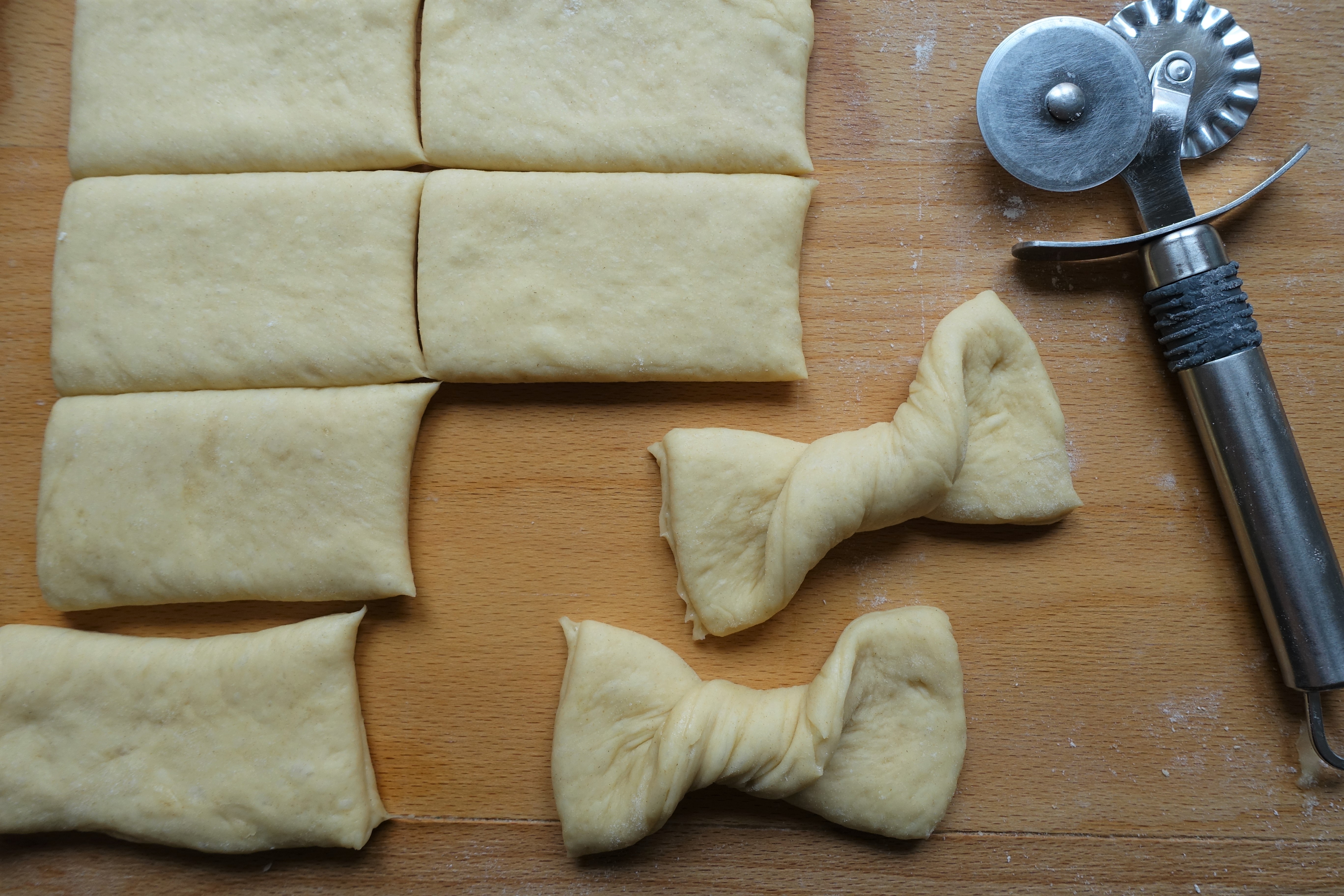 Beide Teigstapel jeweils vorsichtig zu einem Rechteck (ca. 30 x 16 cm) ausrollen. Die Kanten des Rechtecks mit einem Teigroller begradigen (die Teigreste können anschließend beliebig geformt und mitgebacken werden), dann der Länge nach halbieren und jeden Streifen nochmals in kleine Rechtecke radeln (ca. 8 x 5 cm) – so erhält man pro Teigstapel/Rechteck ca. 12 kleine Rechtecke (insgesamt also ca. 24). Diese anschließend (mittig) um 360° drehen. Die so entstandenen Mascherl auf 2 mit Backpapier ausgelegte Bleche legen und nochmals ca. 1-2 Stunden4 gehen lassen.