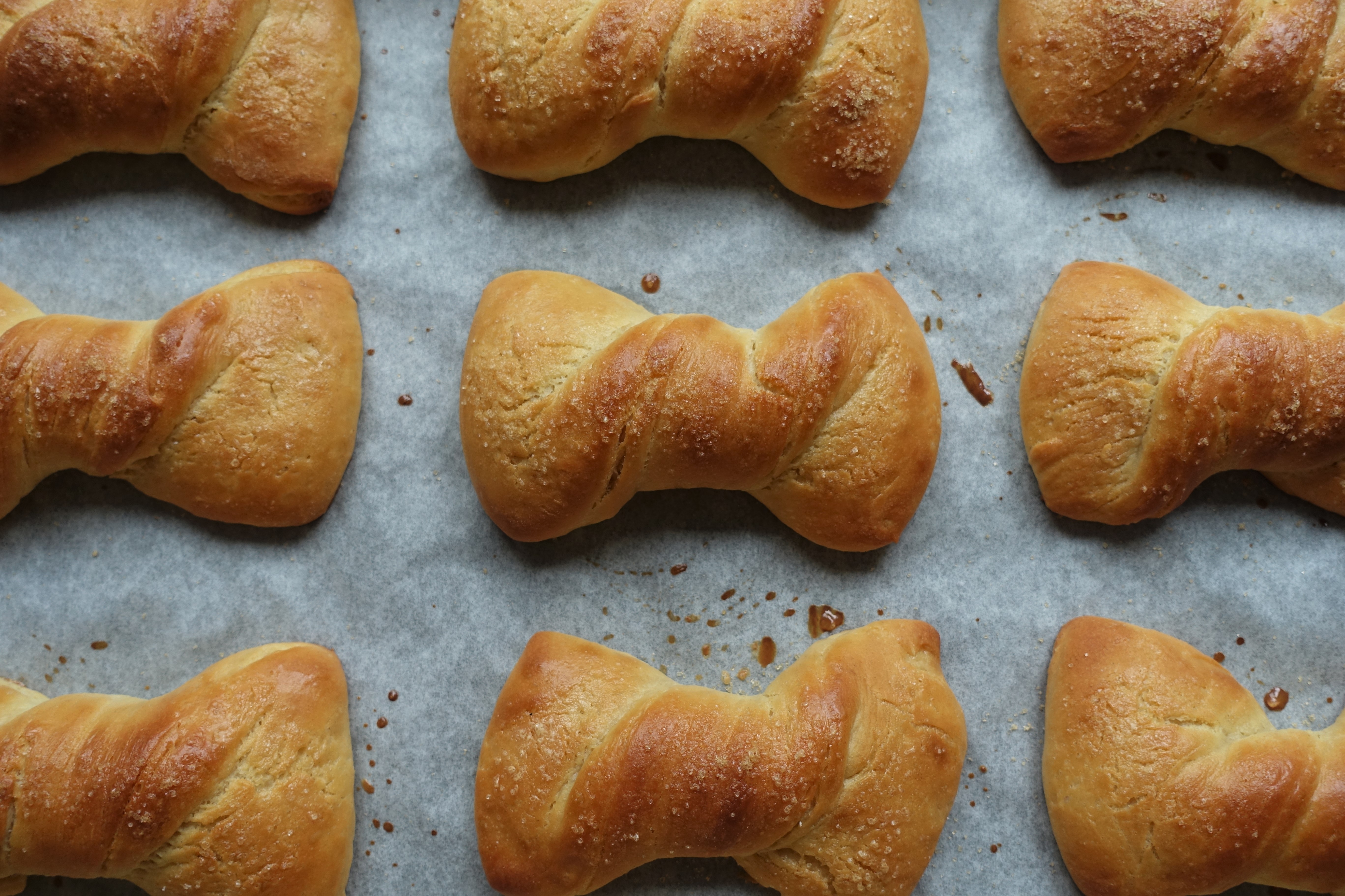 Den Backofen vorheizen (200°C, Ober-/Unterhitze oder 180°C, Heißluft), die Mascherl mit Milch bestreichen, mit dem restlichen Rohrzucker bestreuen und 12-14 Minuten lang goldbraun backen – bei Heißluft kann man beide Backbleche gleichzeitig, bei Ober-/Unterhitze sollte man sie nacheinander in den Ofen schieben.