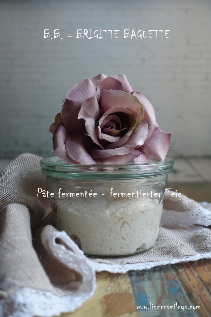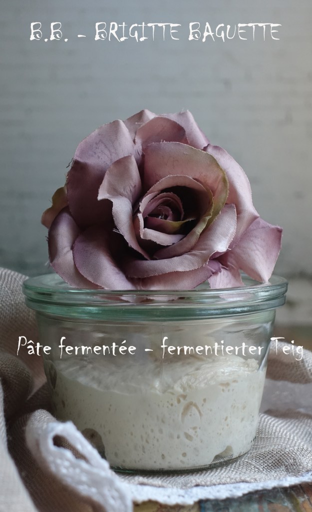 Brigitte kann entweder frisch angesetzt werden* – in diesem Fall muss sie, nachdem sie 1-2 Stunden lang bei Raumtemperatur gegangen ist, vor ihrer Weiterverarbeitung mindestens 12 Stunden im Kühlschrank fermentieren – oder man nimmt (wie ich) ein Stück vom bereits gegangenen, (alten) Baguette-Teig, den man in ein Gefäß mit Deckel gibt und bis zum nächsten Backen kühl zwischenlagert. Vergehen mehr als 4-5 Tage, muss man diesen „alten“ Teig mit Mehl und Wasser etwas „aufhübschen“ – oh, pardon – ich meine natürlich „auffrischen“!