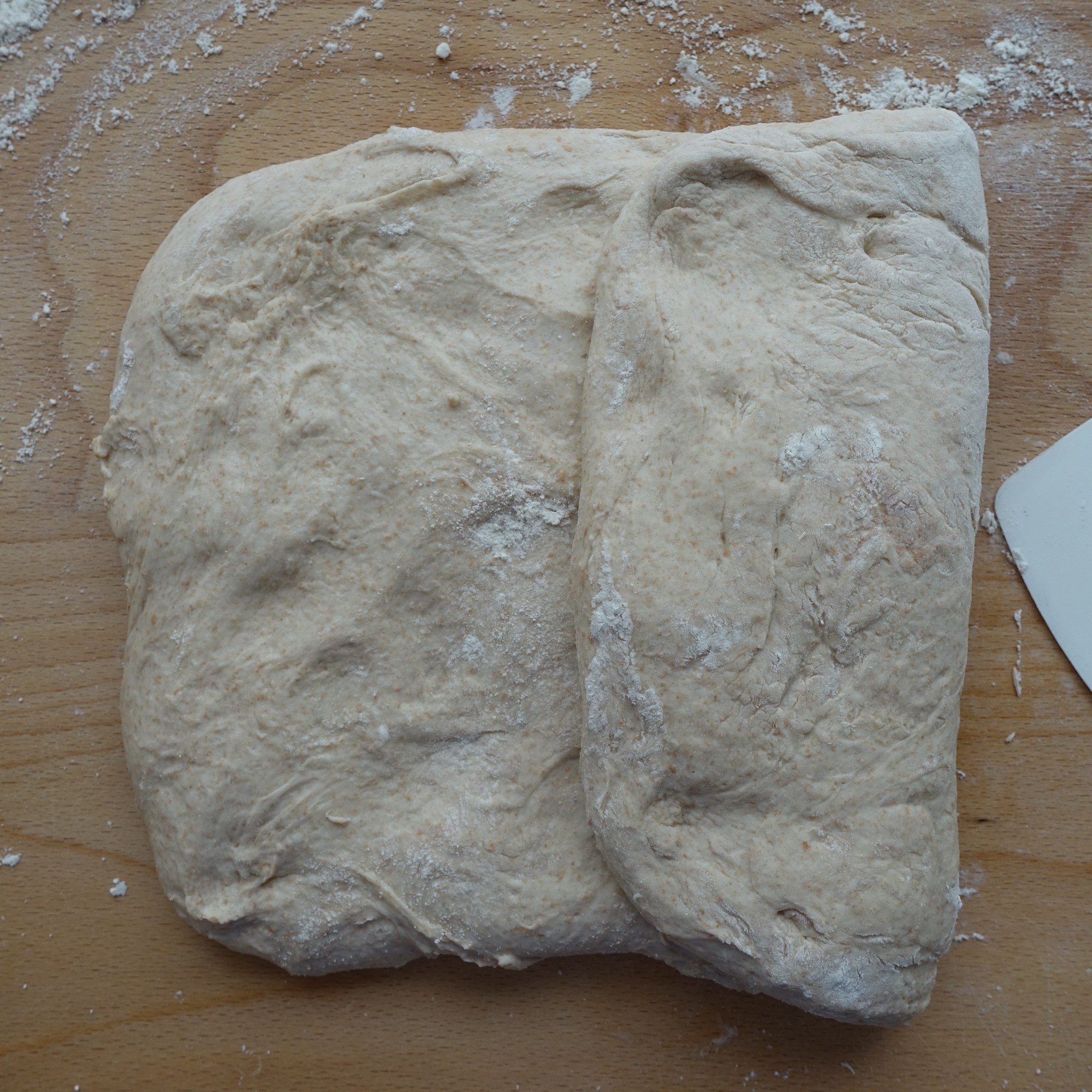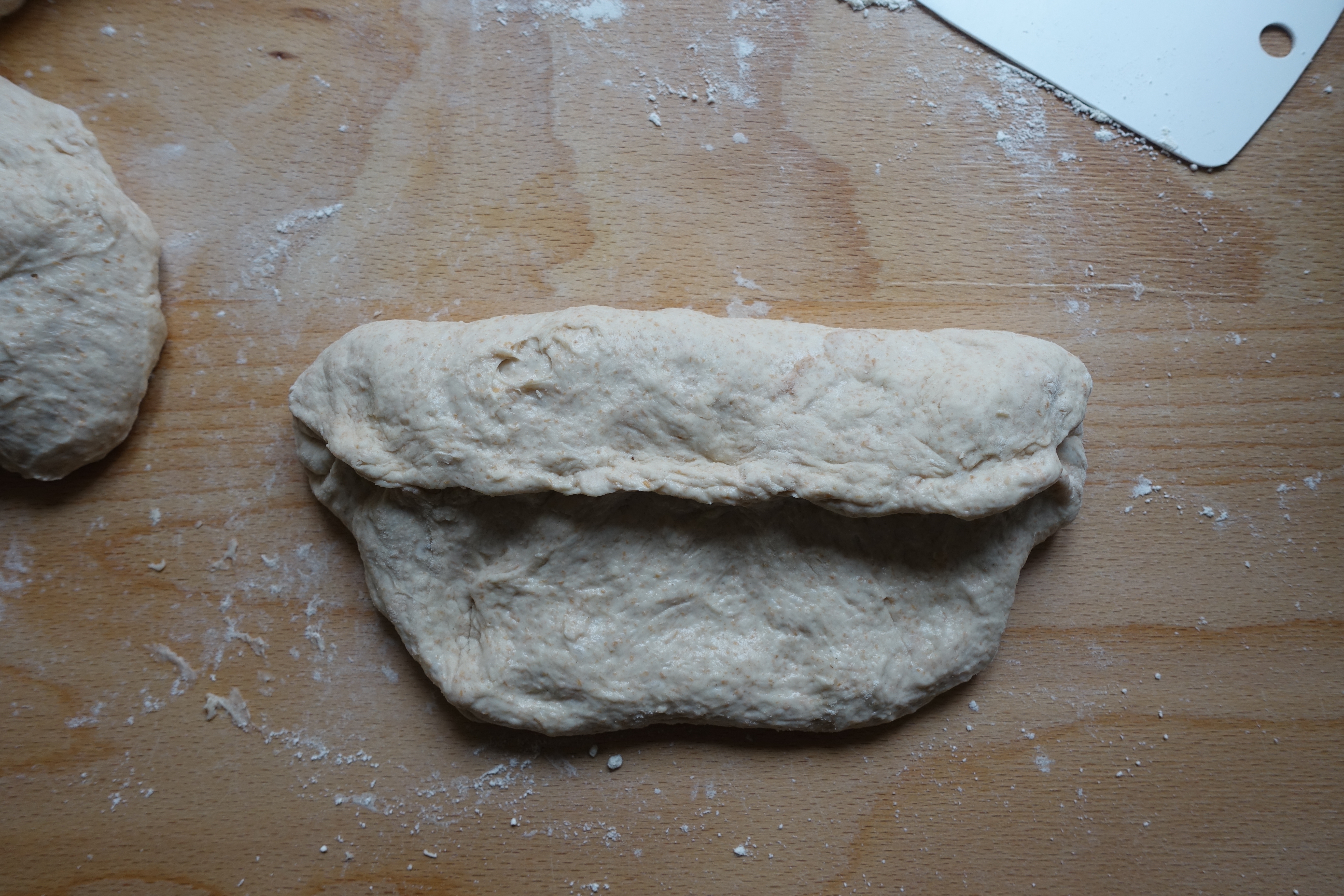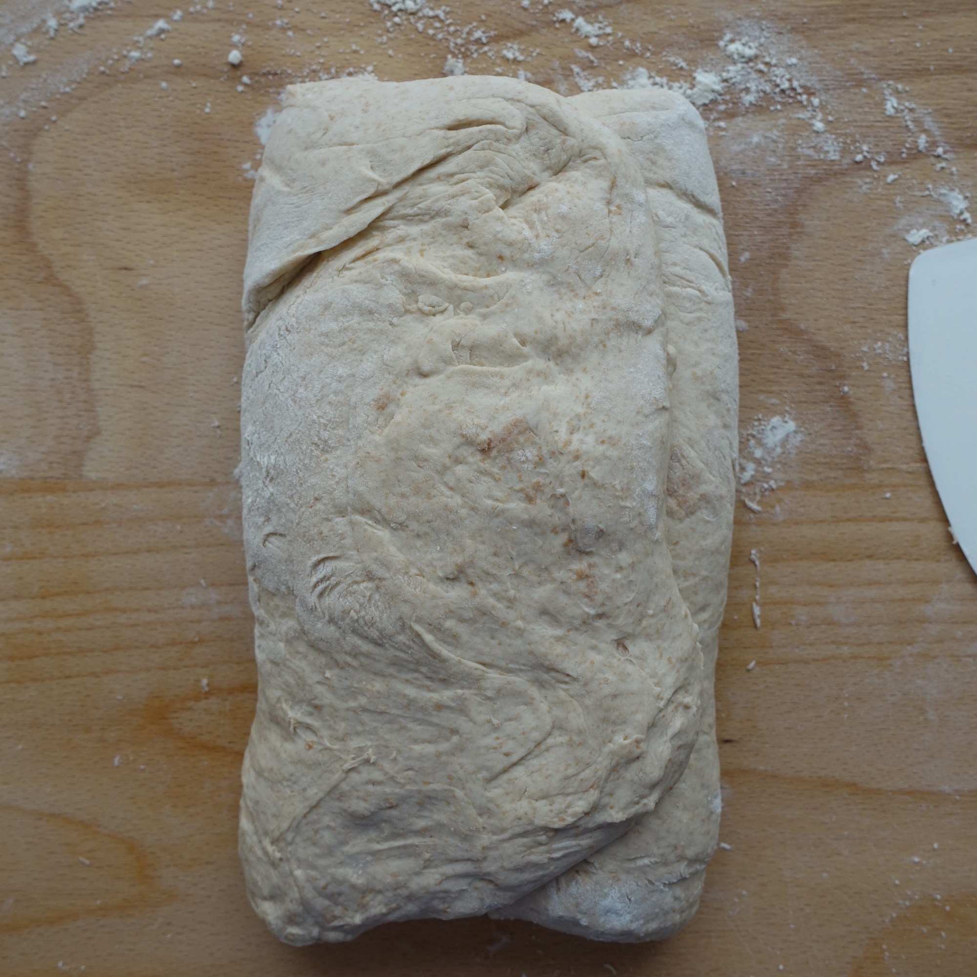 Den restlichen Teig dritteln. Jedes Teigstück auf einer gut bemehlten Arbeitsfläche sanft plattdrücken und das obere Teigdrittel zur Mitte hin falten (dabei die Teigkanten mit den Fingerspitzen etwas festdrücken), dann nochmals falten und die Teigkanten wieder festdrücken.