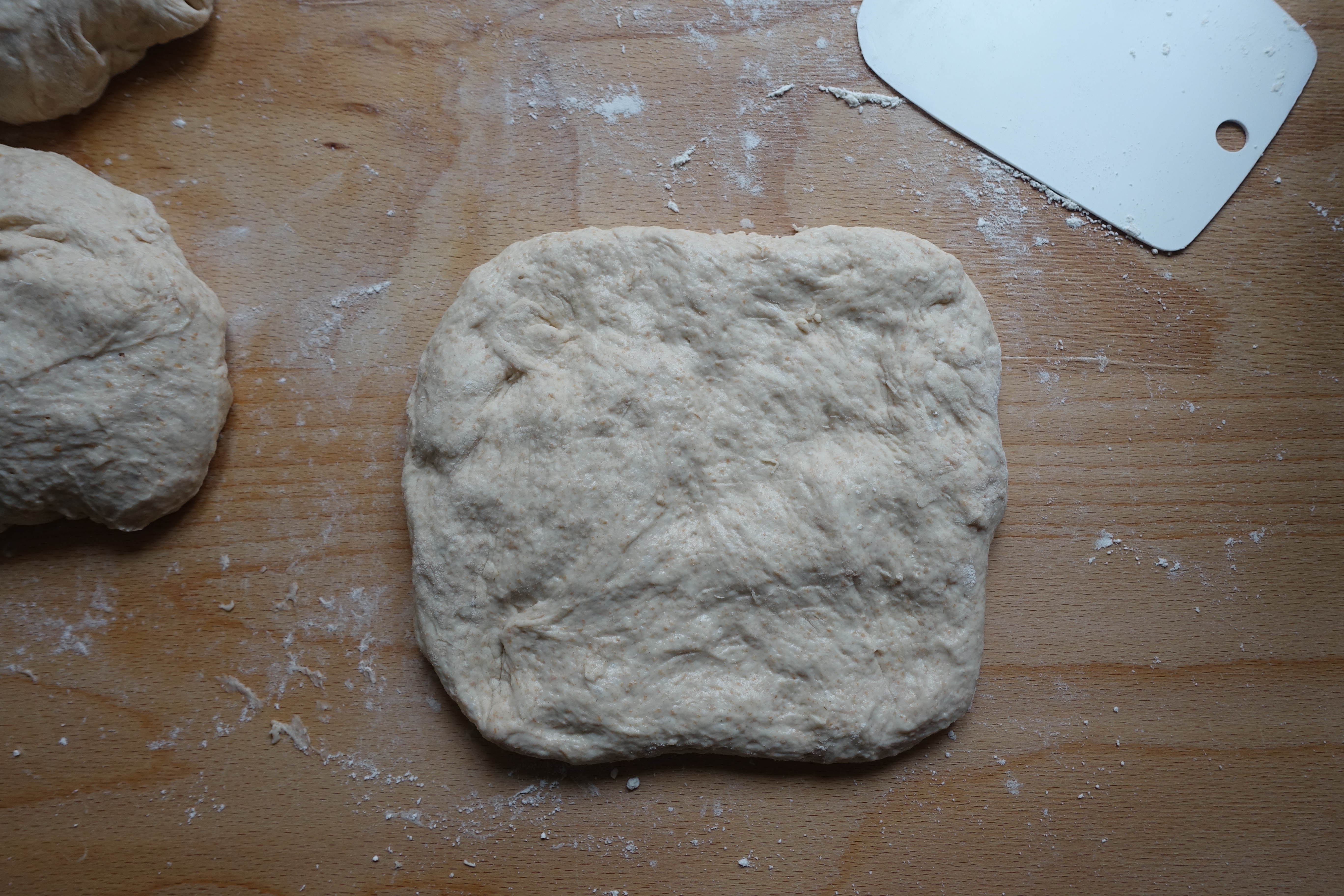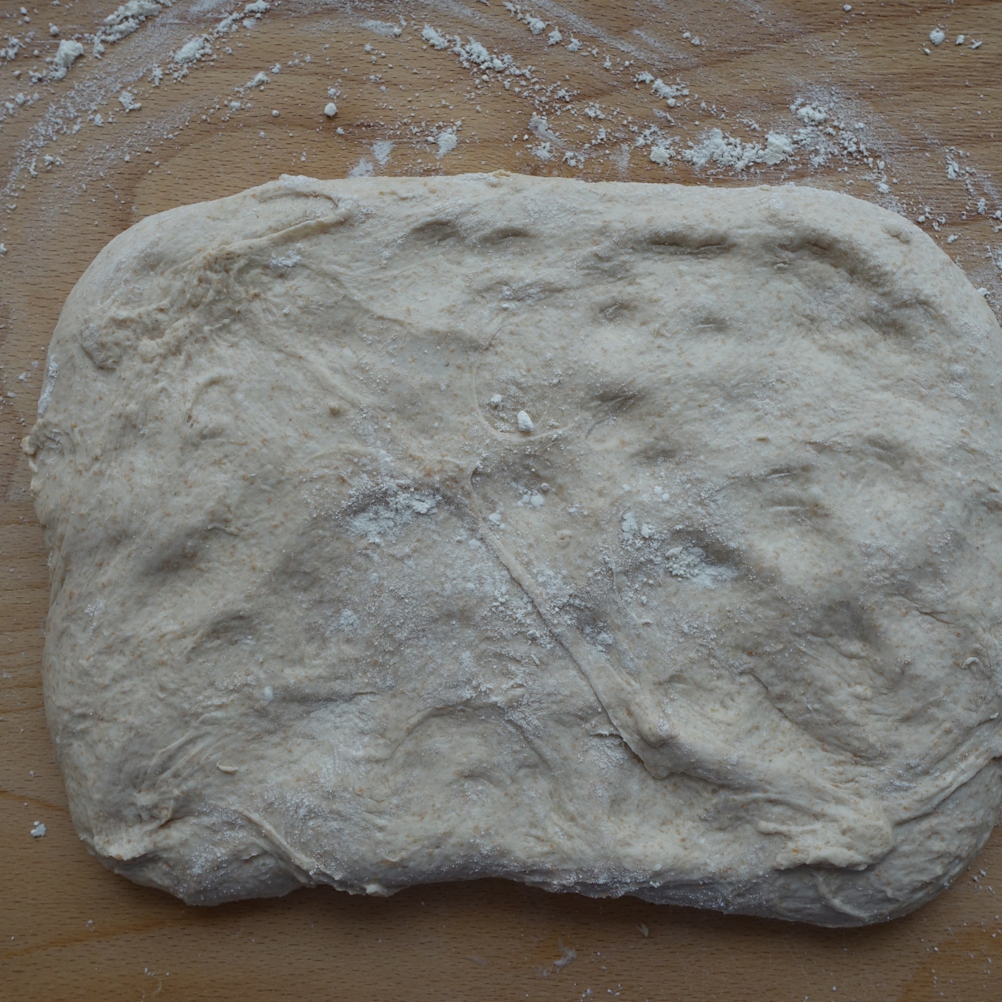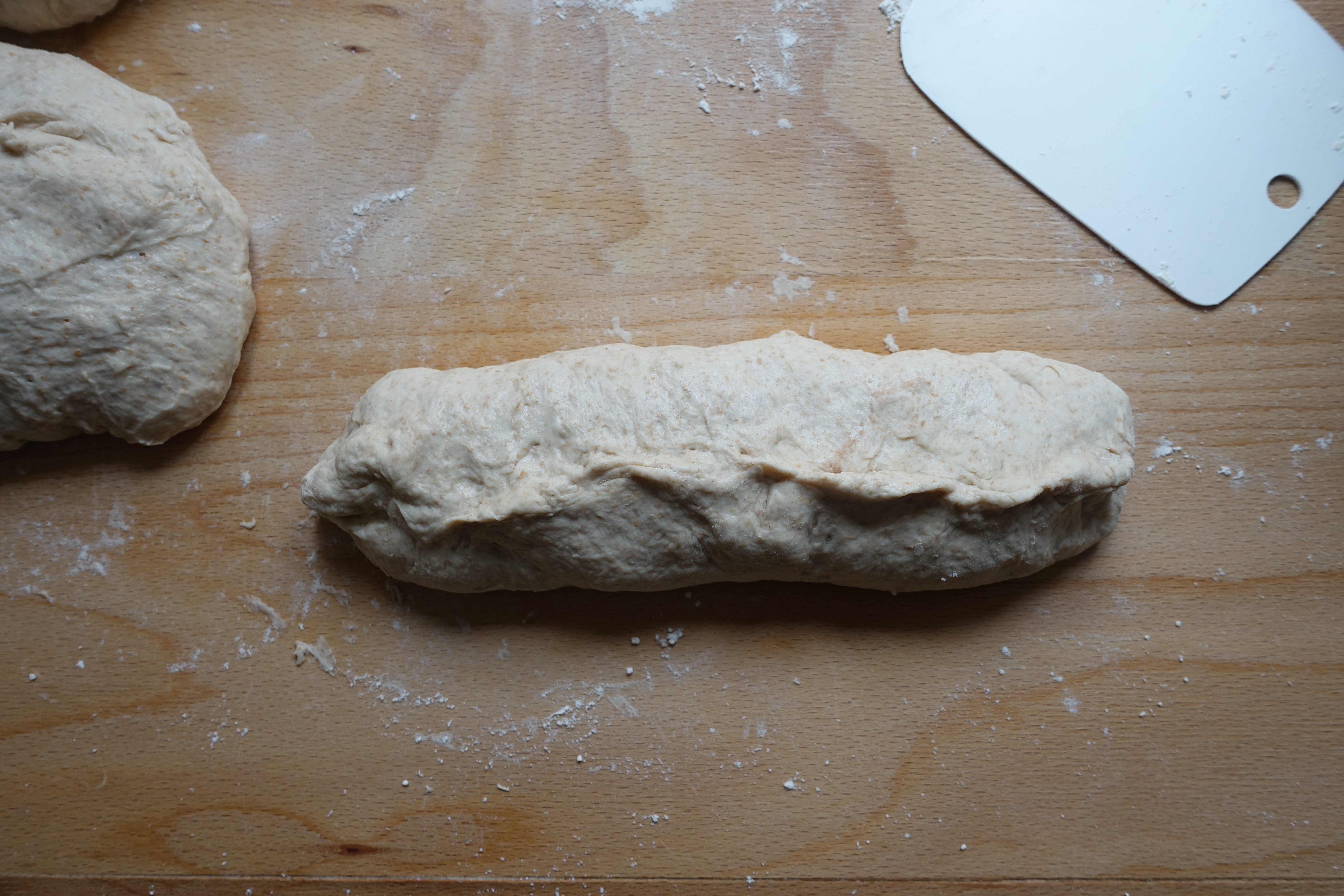 Den restlichen Teig dritteln. Jedes Teigstück auf einer gut bemehlten Arbeitsfläche sanft plattdrücken und das obere Teigdrittel zur Mitte hin falten (dabei die Teigkanten mit den Fingerspitzen etwas festdrücken), dann nochmals falten und die Teigkanten wieder festdrücken.