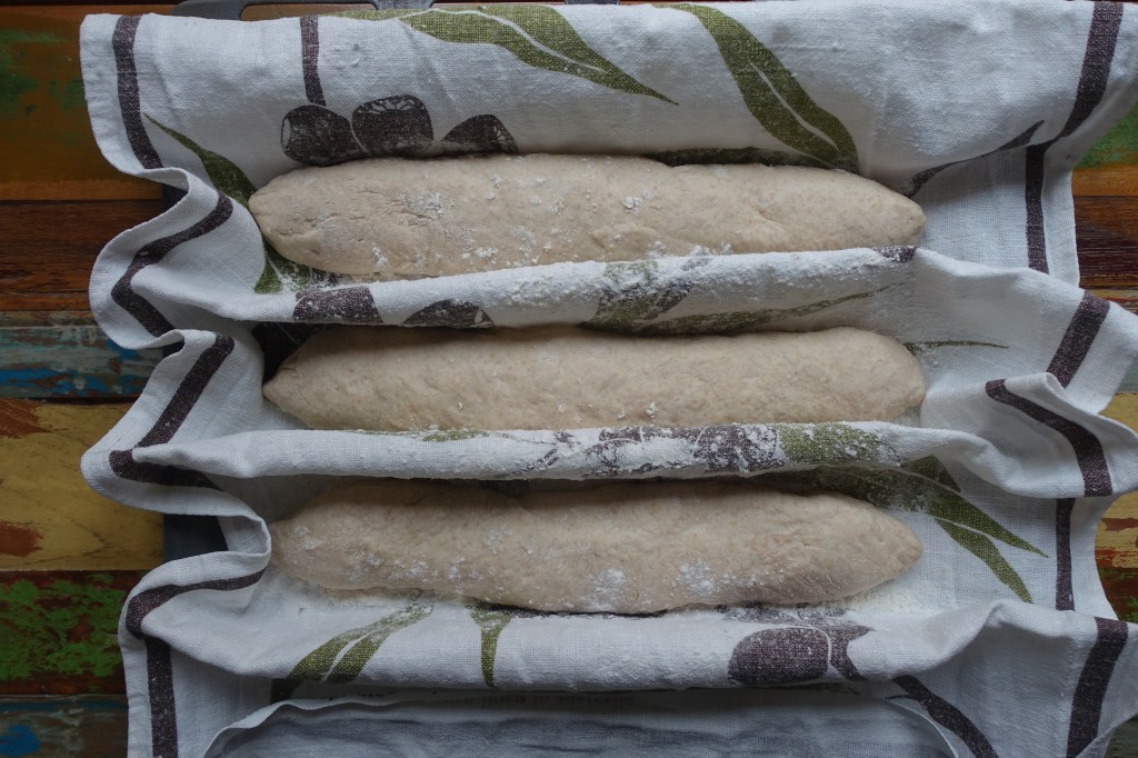 Die so entstandene Teigwurst zu einer Teigstange rollen. Diese leicht mit Mehl bestäuben und auf ein bemehltes Küchentuch legen. Mit den restlichen zwei Teigstücken ebenso verfahren. Zwischen den Baguettes das Küchentuch ein wenig hochziehen.