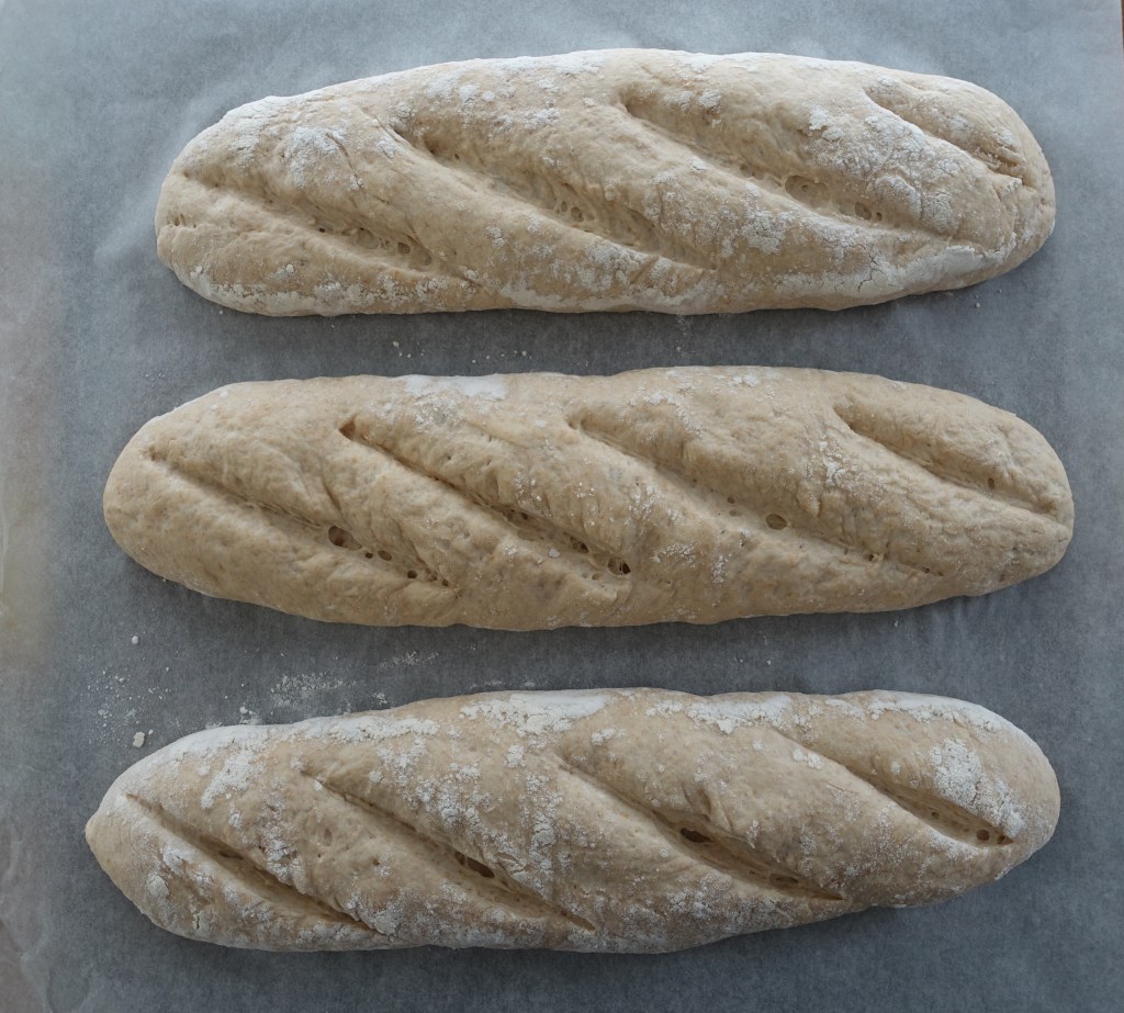 Die Baguettes auf ein mit Backpapier ausgelegtes Blech gleiten lassen und mit einem sehr scharfen Messer mehrmals längs einschneiden.
