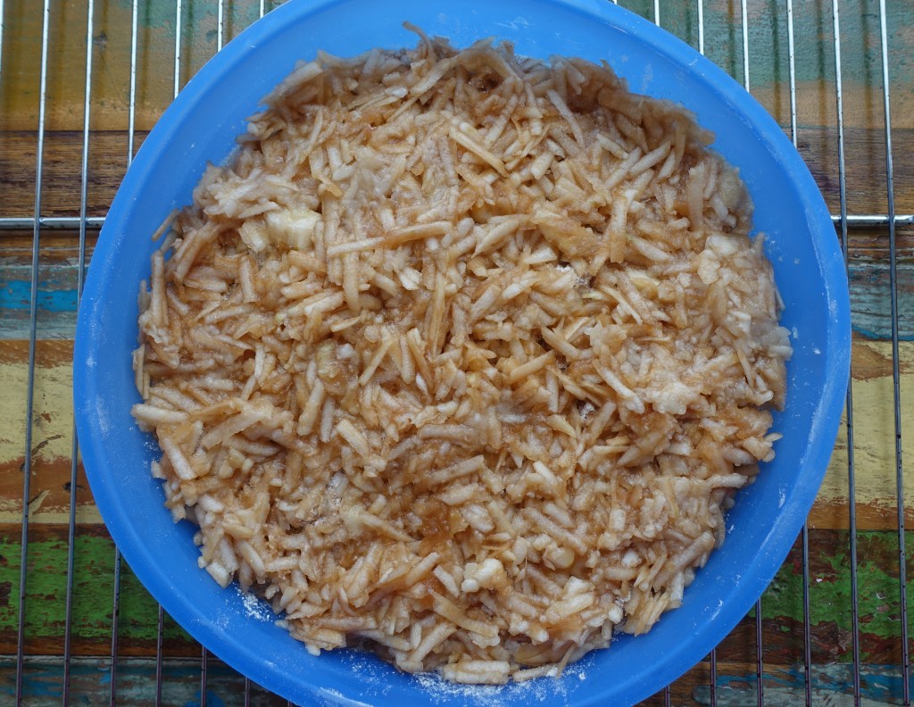 Die Äpfel schälen, entkernen und grob reiben. Mit (Voll-)Rohrzucker, Vanille, Zimt, Zitronenschale und Zitronensaft vermischen.