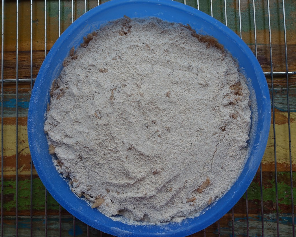 Mehl, Backpulver, Grieß und (Birken-)Zucker in eine Schüssel mit Deckel geben, verschließen und schütteln.