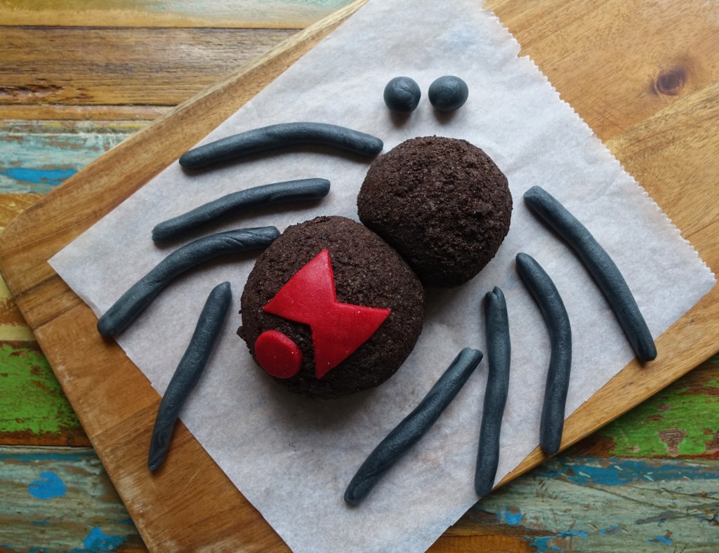 - ein paar dunkle Schoko-Kekse mit heller oder dunkler Füllung (fein zerbröselt) zum Wälzen des Spinnenkörpers