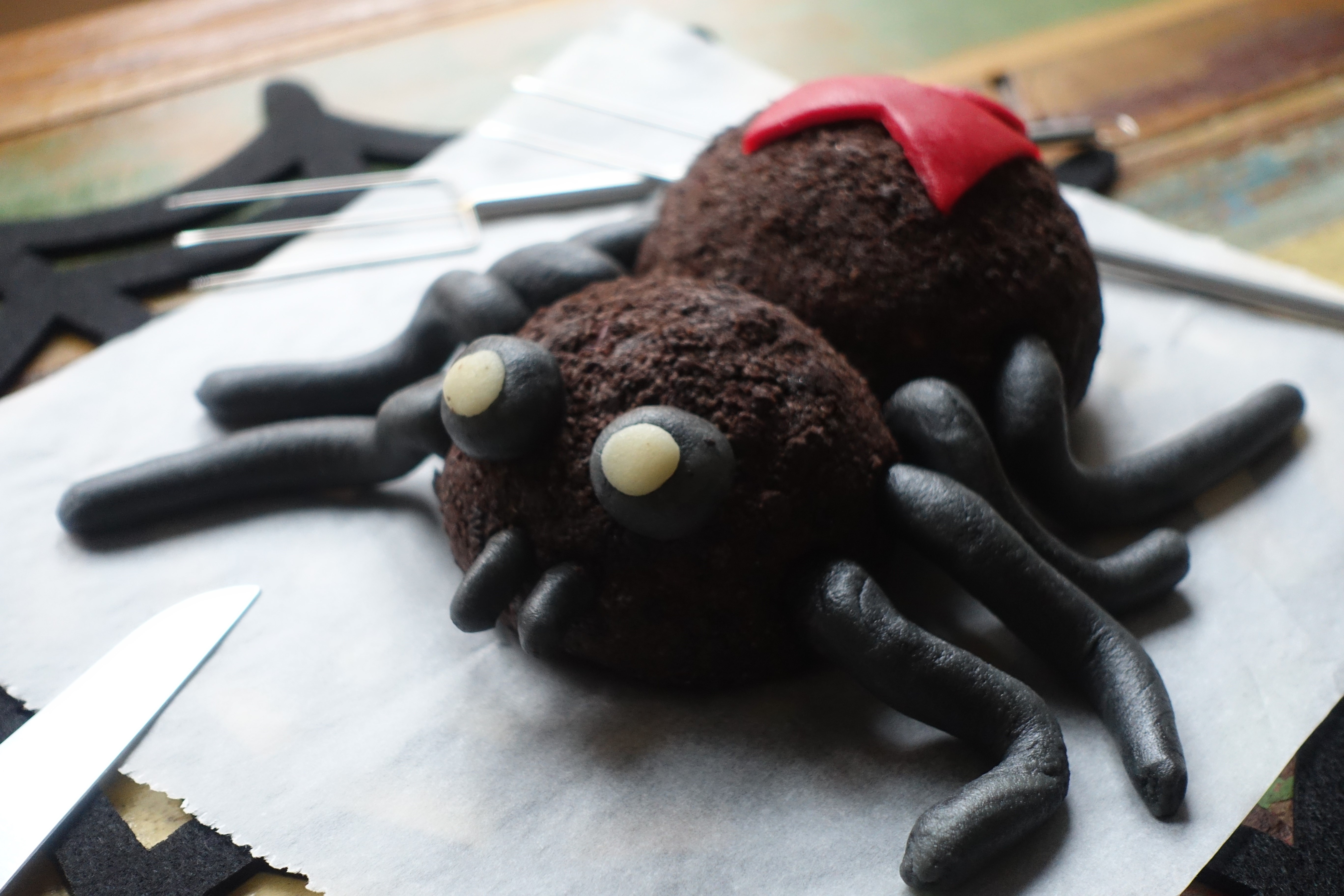 Den Spinnenkörper aus dem Kühlschrank nehmen und zuerst die rote Rückenzeichnung befestigen. Mit einem Kochlöffelstiel vorsichtig mehrere Vertiefungen in den Körper drücken – und zwar dort, wo die Augen, die Beine und das Mundwerkzeug befestigt werden sollen. Diese dann im Anschluss vorsichtig in die Vertiefungen drücken. Zum Schluss noch die hellen Marzipankugeln als Pupillen in die Augen drücken. Fertig!