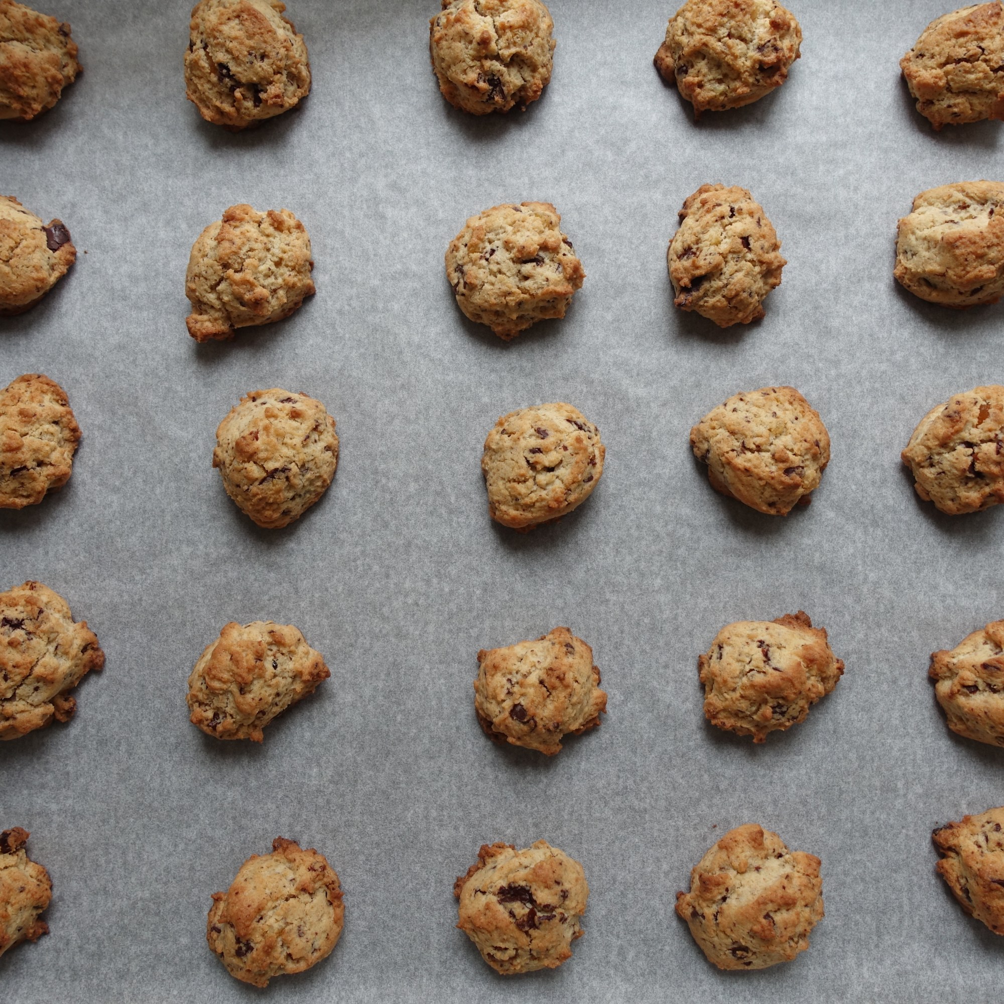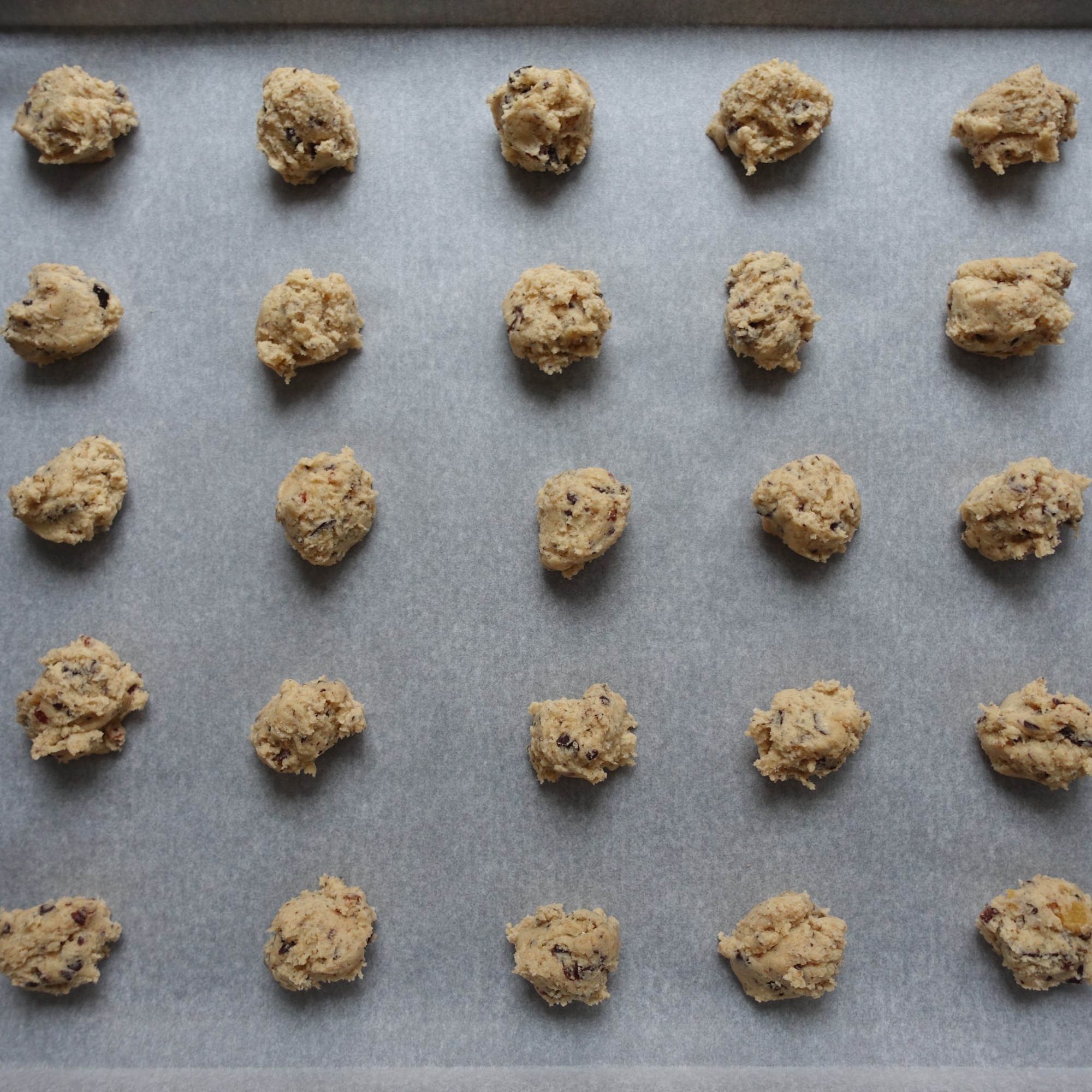 In einer Schüssel Butter und Zucker cremig rühren. Das Ei hinzufügen, dann Rosinen, Aranzini und Schokoladestücke unterrühren. Anschließend das mit Backpulver vermischte Mehl untermengen. Danach mithilfe von 2 Teelöffeln kleine Häufchen formen und diese (mit ausreichend Abstand) auf zwei mit Backpapier ausgelegte Backbleche setzen.