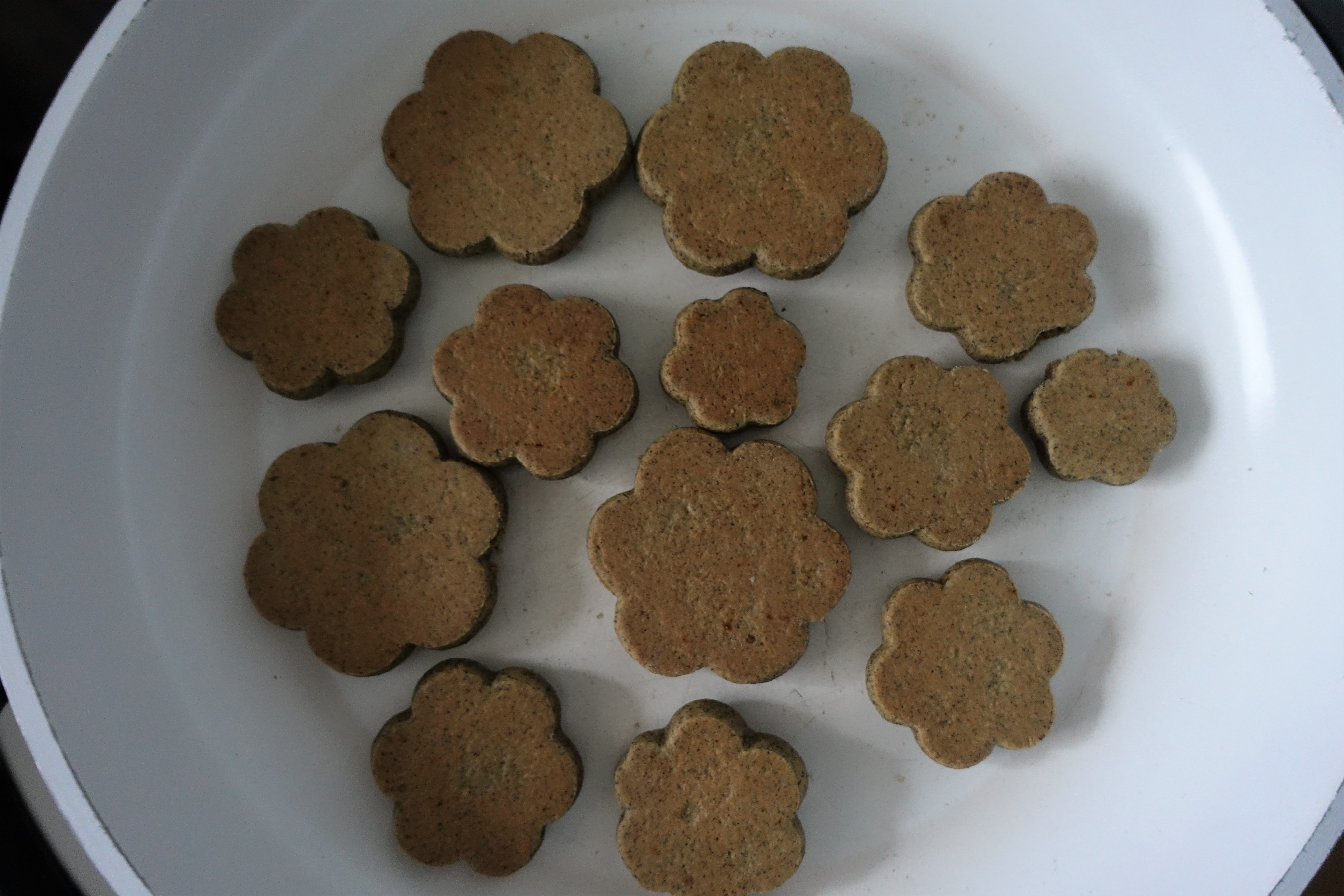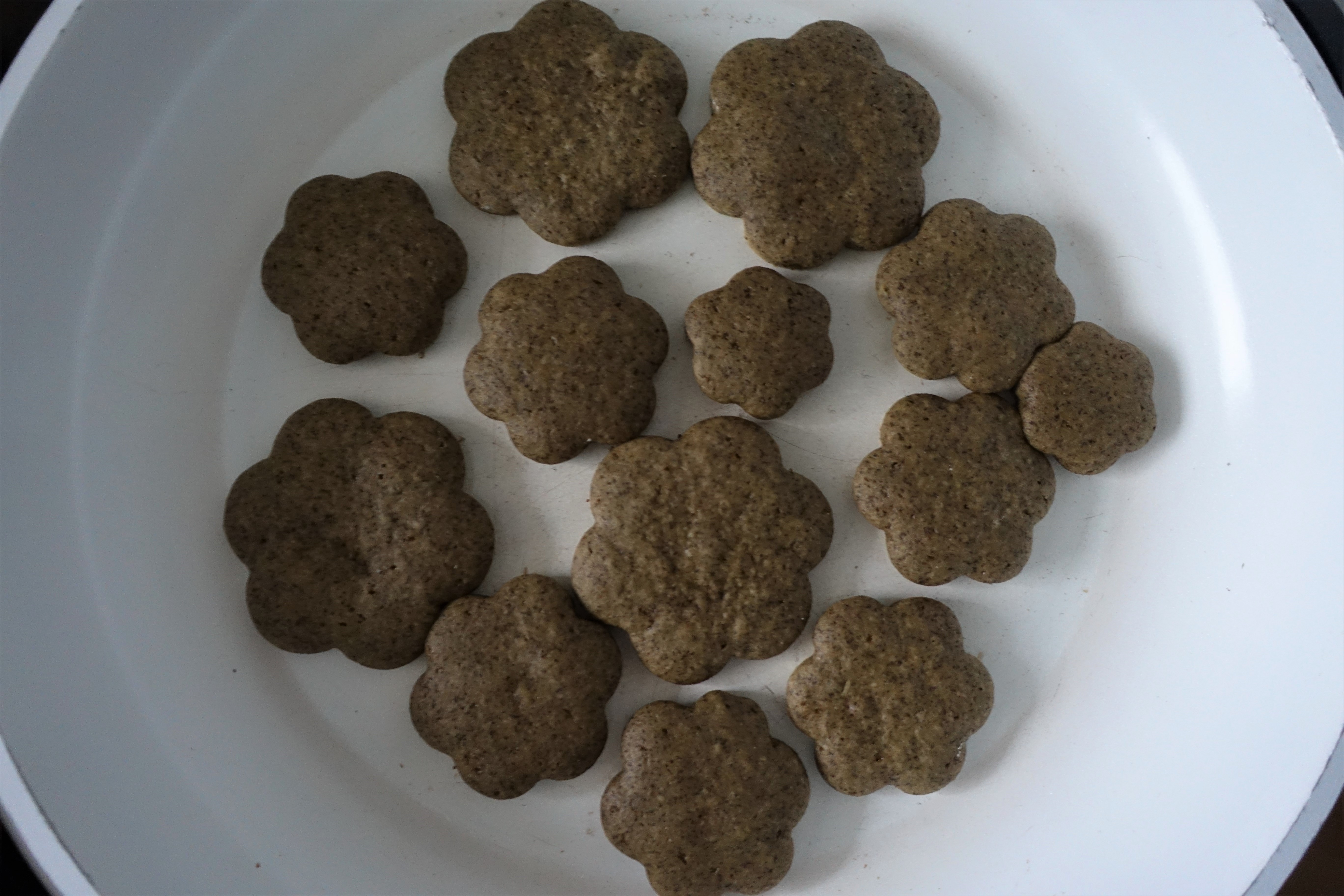 Die Kekse anschließend portionsweise in der Pfanne herausbacken. Diese hierfür ohne Fett erhitzen, Kekse einlegen (nicht zu viele auf einmal!), zudecken, die Temperatur herunterschalten und 5-6 Minuten backen, die Kekse dann umdrehen, den Deckel wieder auf die Pfanne geben und für weitere 5-6 Minuten fertig backen. **