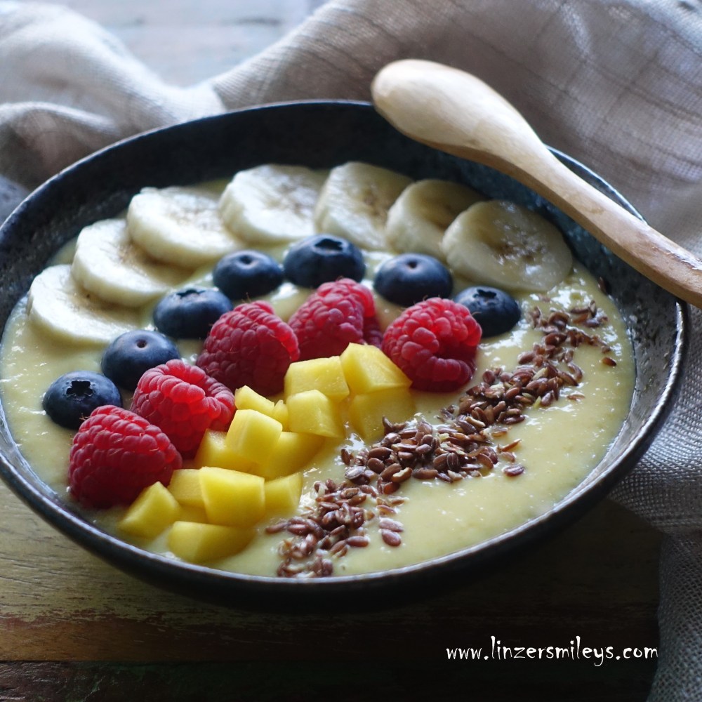 für das Topping: in Scheiben geschnittene Banane, Mangowürfel, Himbeeren, Heidelbeeren/Blaubeeren und einige Leinsamen