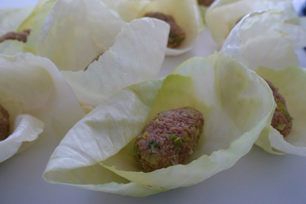 • ca. 10 große (oder 20 kleine) Weißkraut-/Weißkohlblätter, überbrüht und abgeschreckt