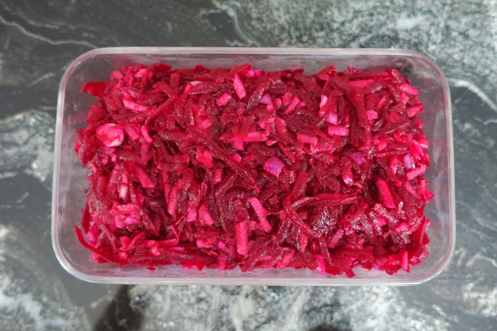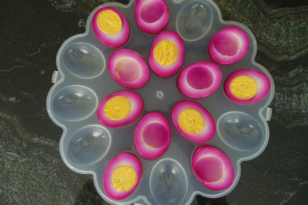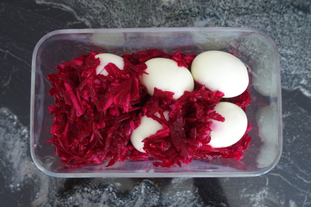 Ganz easy-peasy und auf natürliche Weise! Alles, was man dafür braucht, sind hart gekochte, geschälte Eier und ein (am besten selbst gemachter) Rote-Rüben-Salat.