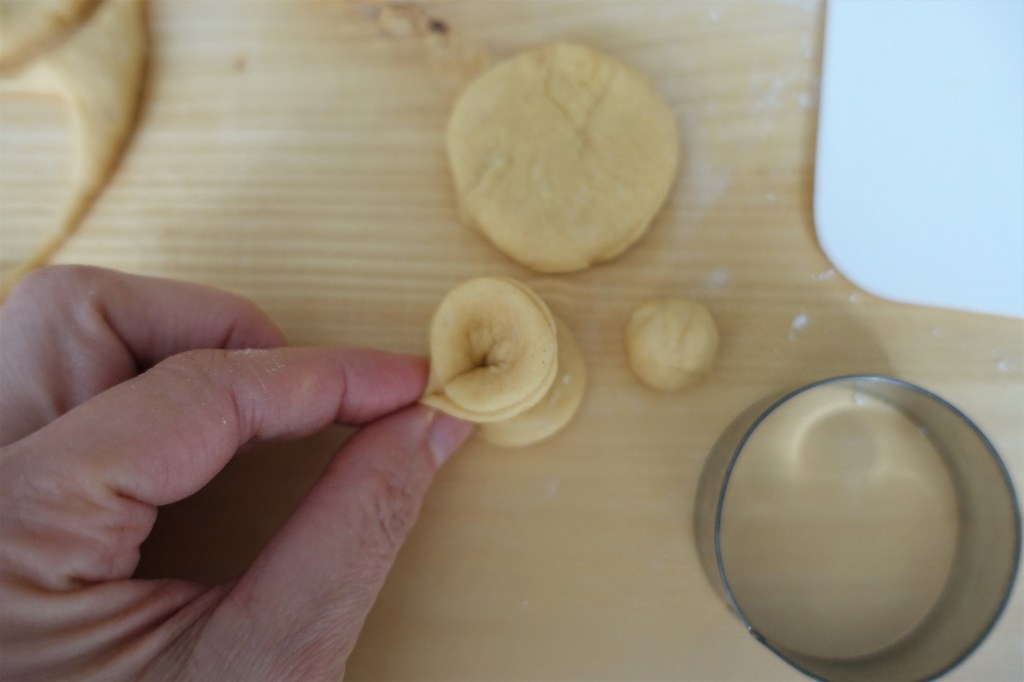 Den Teig hierfür auf einer leicht bemehlten Arbeitsfläche nicht zu dünn ausrollen und mit dem Ausstecher Kreise ausstechen. Aus den Teigresten kleine Kügelchen formen – pro Blume werden ein Kügelchen und 5 Kreise für die Blütenblätter benötigt.