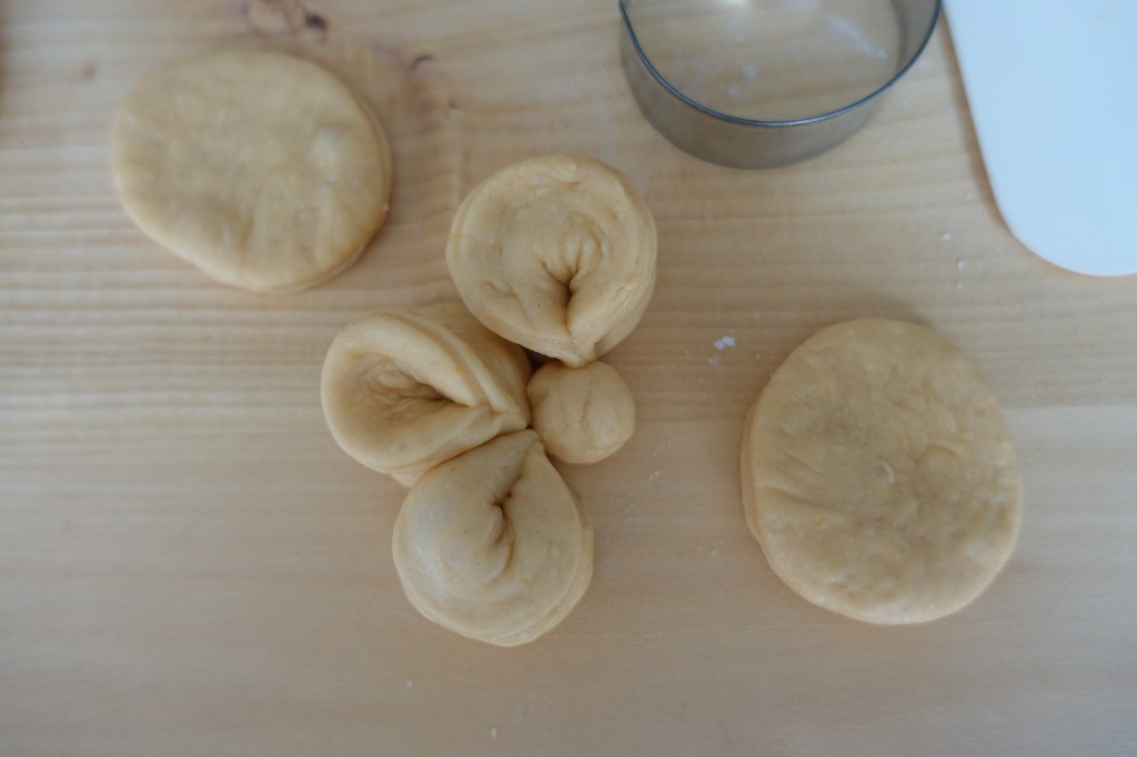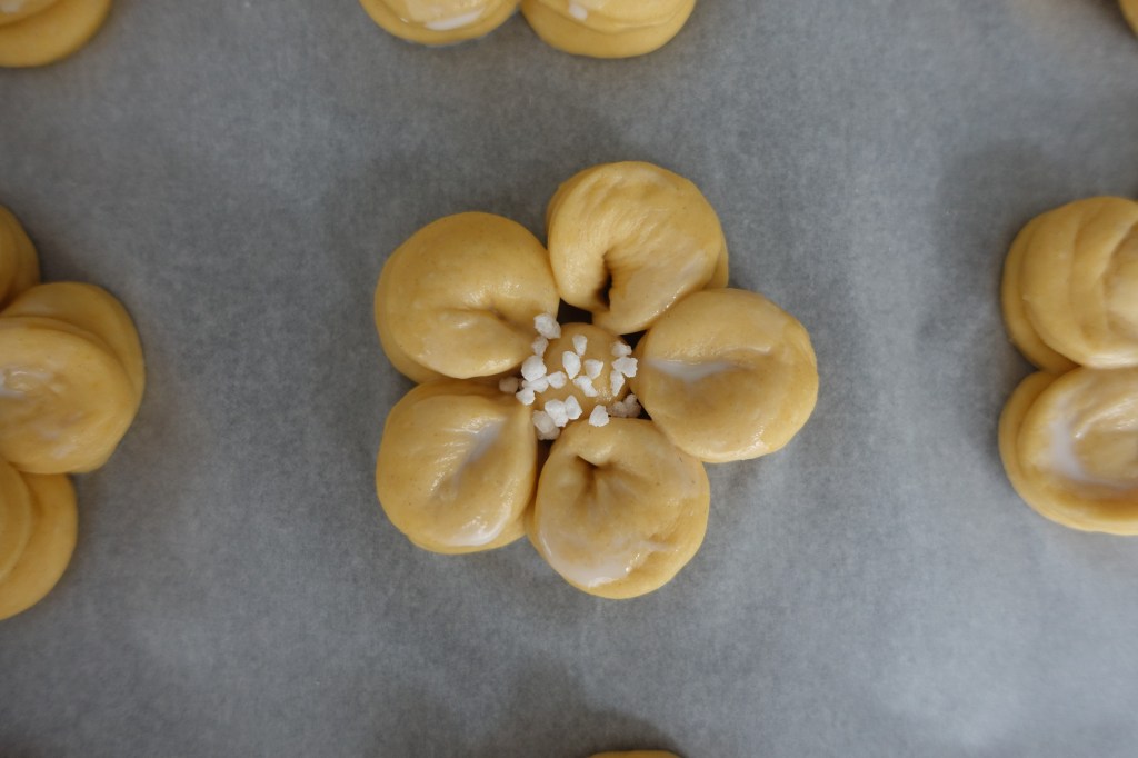 Das Kügelchen bildet die Mitte. Dieses wird zuerst auf ein mit Backpapier ausgelegte Backblech gesetzt (insgesamt werden 2 Bleche benötigt 😉). Die 5 Teigkreise zuerst zu Halbmonden zusammenklappen, diese dann an den Enden (mithilfe von Daumen und Zeigefinger; die Rundungen der Monde zeigen dabei nach außen) sanft zusammendrücken. Die so entstandenen Blütenblätter rund um das Teigkügelchen anordnen. Fertig ist das Briocheblümchen 🌼!
