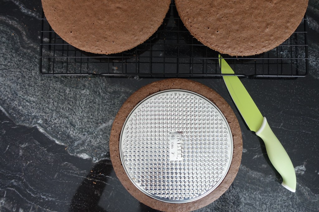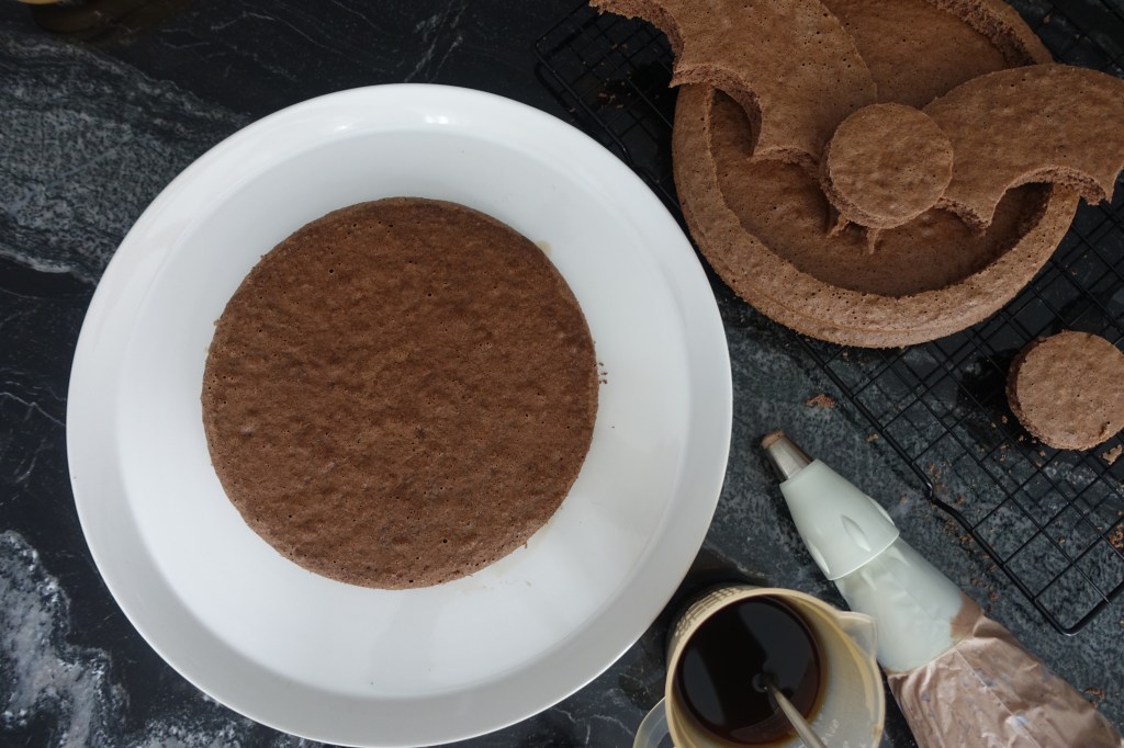 Die Schablone auf den Biskuitboden legen und mit einem scharfen Messer rundherum schneiden. Den so entstandenen Teigring beiseitelegen.