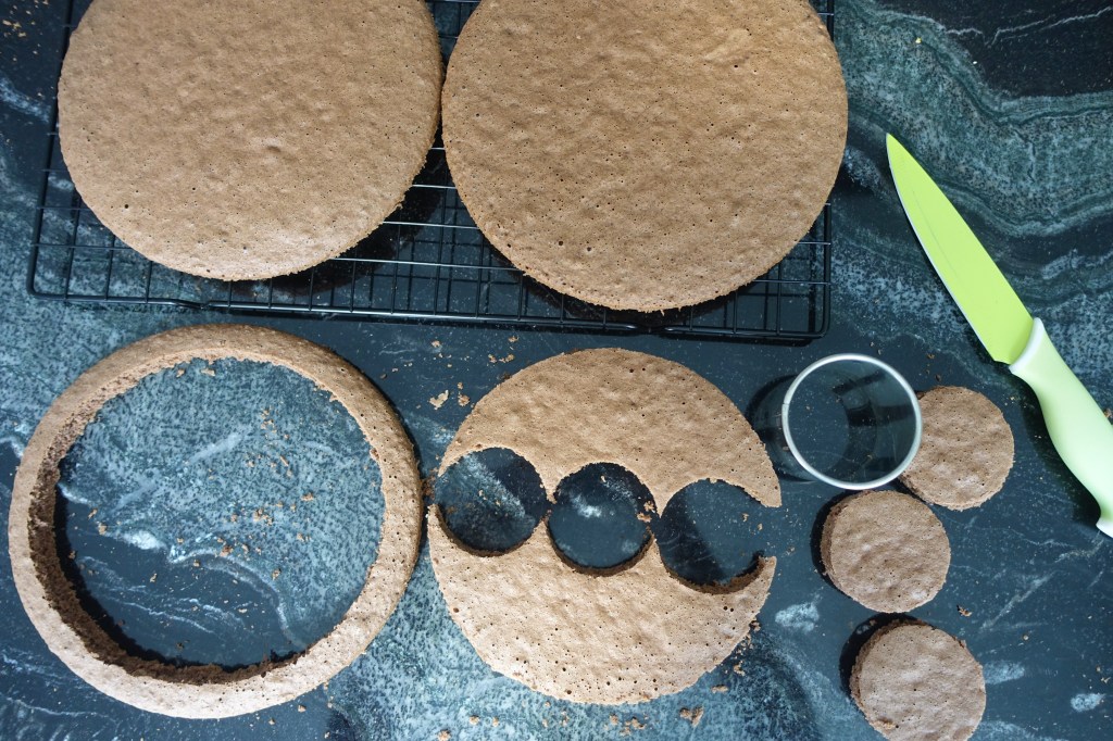 Herstellung der Torten-Deko: Zuallererst einen Ring (= Tortenrahmen) aus einem der drei Biskuitböden ausschneiden. Dafür eignet sich eine kreisförmige Schablone, die etwas kleiner ist als der Biskuitboden – ich habe dafür einen Springformboden mit einem Durchmesser von 16 cm verwendet (siehe das Foto unten links 😉).