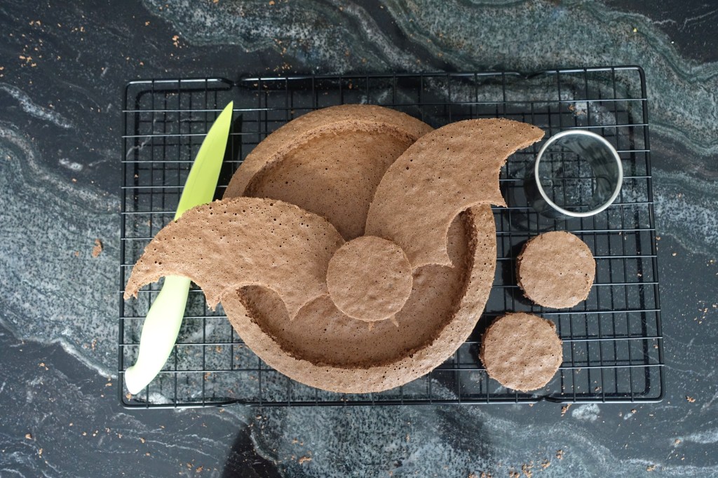 Aus dem inneren Teigkreis die Fledermaus-Flügel und den Kopf fertigen: Hierfür mit einem kleinen, runden Ausstecher 3 Teigkreise entlang der Mittellinie ausstechen – so entstehen 2 große, halbierte Teigstücke – die Fledermaus-Flügel. →Von den 3 ausgestochenen kleinen Teigkreisen wird übrigens nur einer für den Kopf benötigt (die restlichen 2 können sofort vernascht werden 😋).