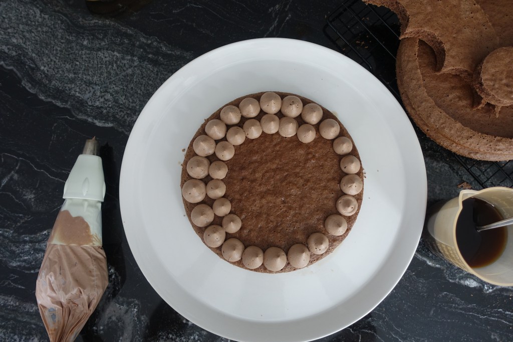 Um den Tortenring gut platzieren zu können, ist es ratsam, zuerst nur am Tortenrand Creme-Tupfen aufzuspritzen. Den Tortenring dann behutsam auf den „Creme-Ring“ legen und mit etwas Kaffee beträufeln. Erst danach den inneren Teil der Torte mit Creme-Tupfen verzieren.