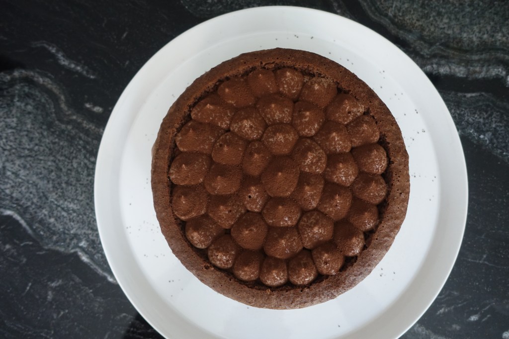 Komposition: Einen Tortenboden auf einen flachen Teller legen und mit einem Drittel der Kaffee-Mischung beträufeln. Ein bisschen weniger als die Hälfte der Creme in Form von kleinen Tupfen aufspritzen, dann einen weiteren Tortenboden darauflegen, diesen sanft festdrücken und mit Flüssigkeit beträufeln.