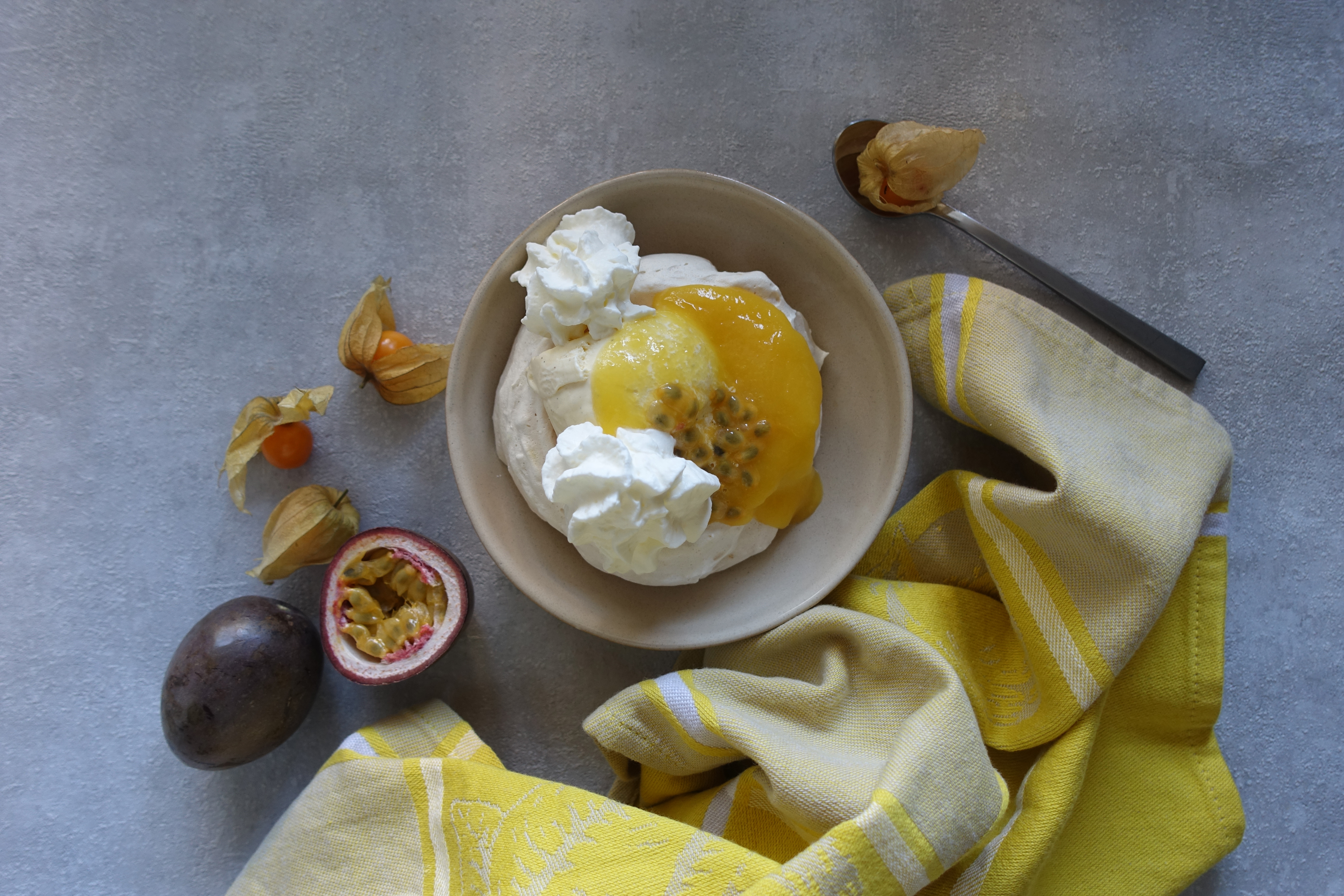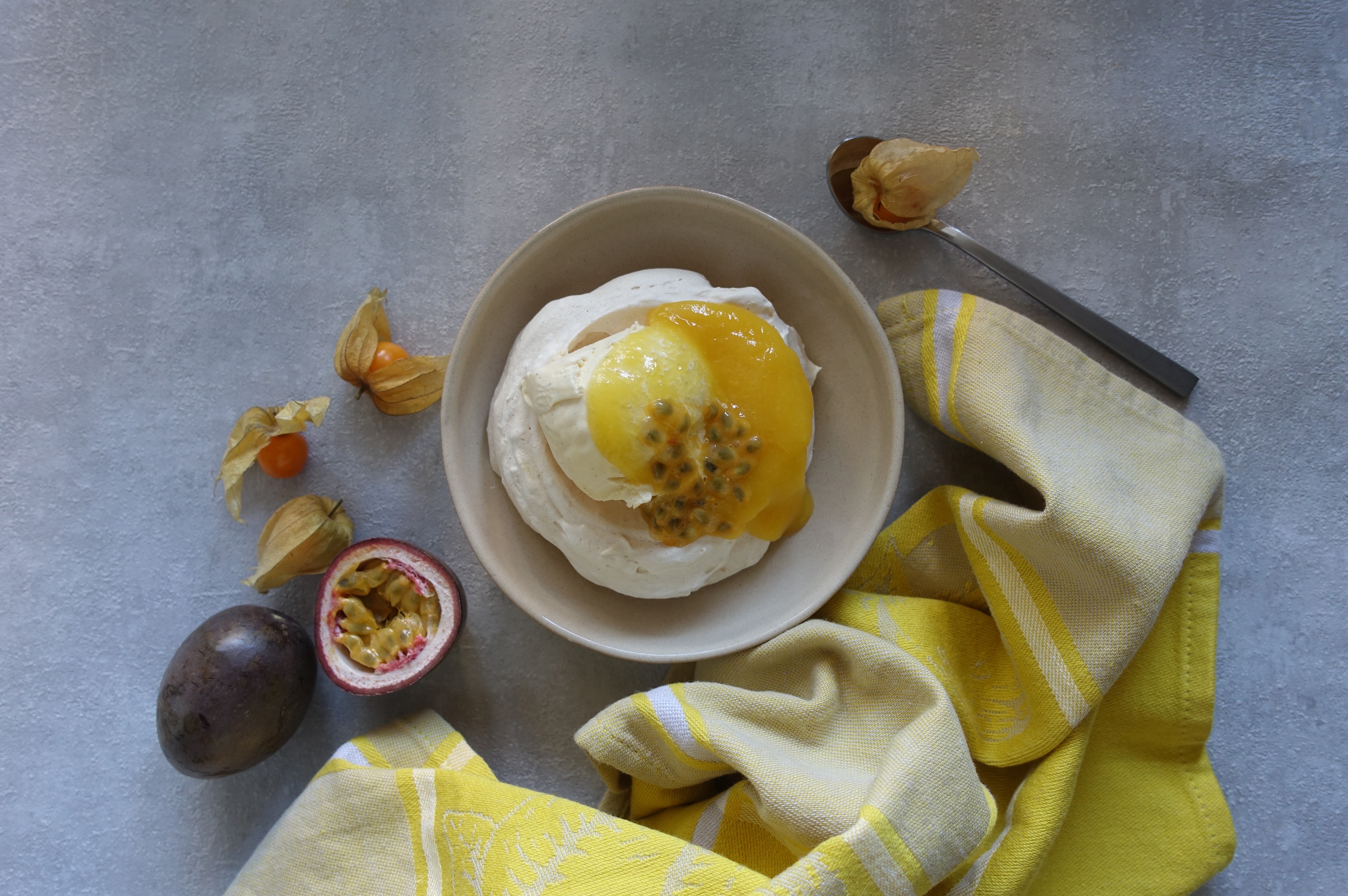 Ich gestehe: Damit man nicht schon beim Lesen des Titels zunimmt, habe ich ihn einfach ein wenig schlanker gestaltet 🤭… Weil man die zuckersüße Wahrheit aber nicht auf ewig verschweigen kann, folgt hier sogleich der vollständige Name dieser Köstlichkeit: Mini-Kokos-Pavlova mit Vanille-Eis, Schlagobers & Mango-Maracuja-Coulis.