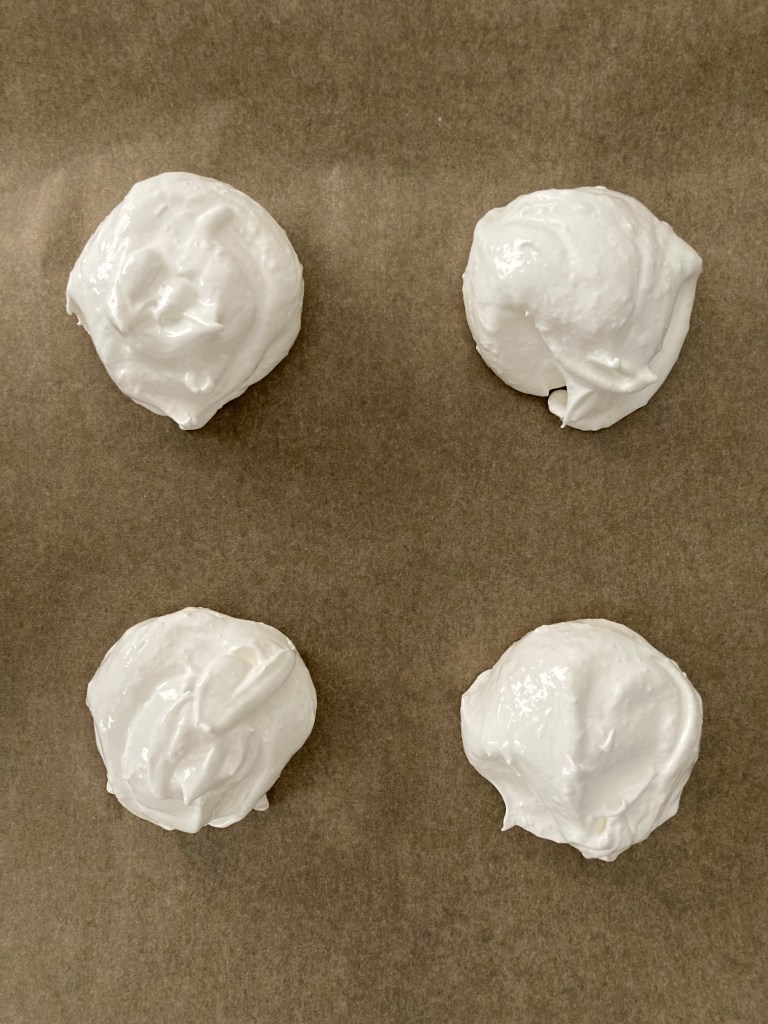 Mit einem Esslöffel aus der Masse 4 gleich große Häufchen auf das Backblech setzen. Mit dem Löffel dann jeweils mittig einen kleinen Krater formen.