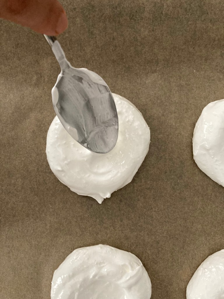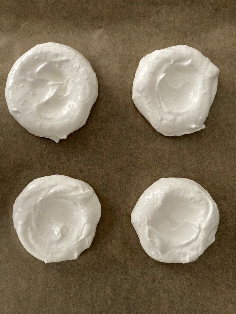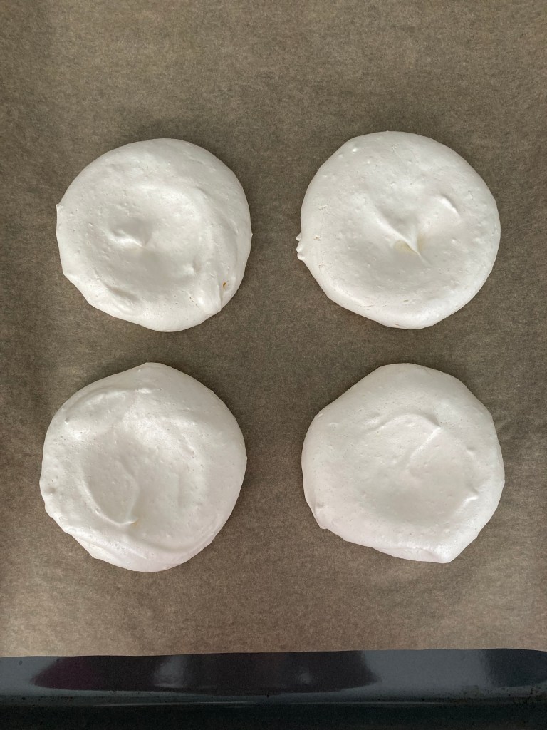 Die Pavlovas für ca. 40-45 Minuten backen. Den Ofen dann ausschalten, die Pavlovas aber noch für ca. 30 Minuten im geschlossenen Ofen lassen.