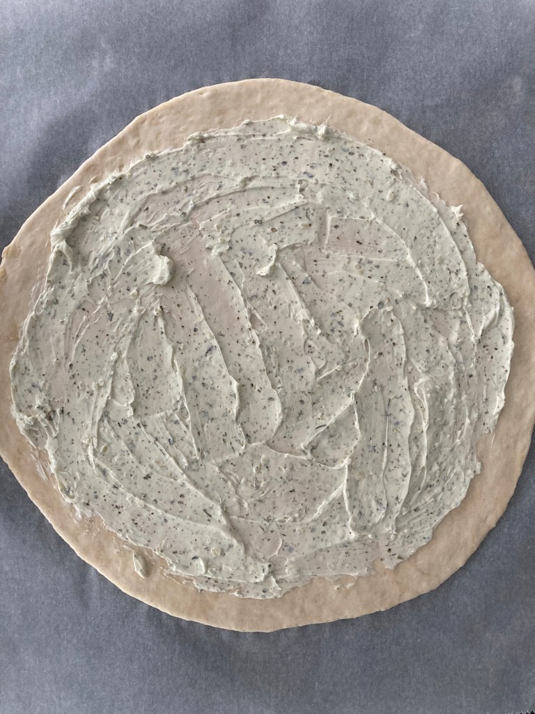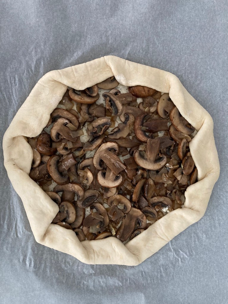 Den Teig auf Backpapier kreisrund ausrollen, mit Frischkäse bestreichen (dabei rundherum einen Rand von ca. 3 cm frei lassen) und die gebratenen Champignons darauflegen. Anschließend den Teigrand vorsichtig einklappen und sanft festdrücken.