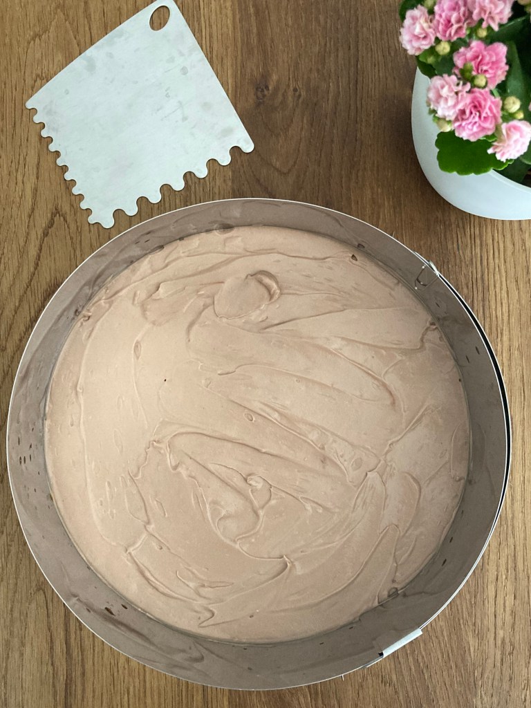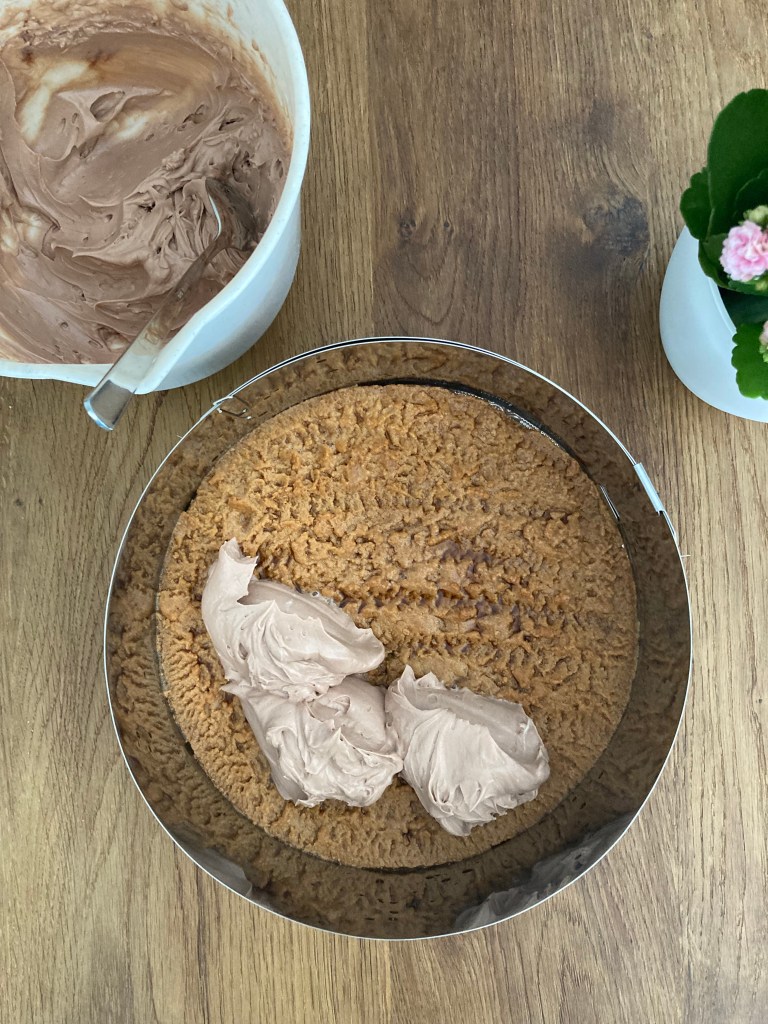 Für die Creme Mascarpone, Schlagobers, Nuss-Nougat-Creme und Staubzucker in eine Schüssel geben und mit dem Handmixer cremig aufschlagen. Die Creme gleichmäßig auf den Tortenboden streichen (sie kann auch in einen Spritzsack gefüllt und aufdressiert werden – in diesem Fall ist der Einsatz eines Tortenrings nicht nötig 😉). Die Oberfläche glattstreichen und nach Belieben mit Hilfe eines Tortenkamms verzieren.