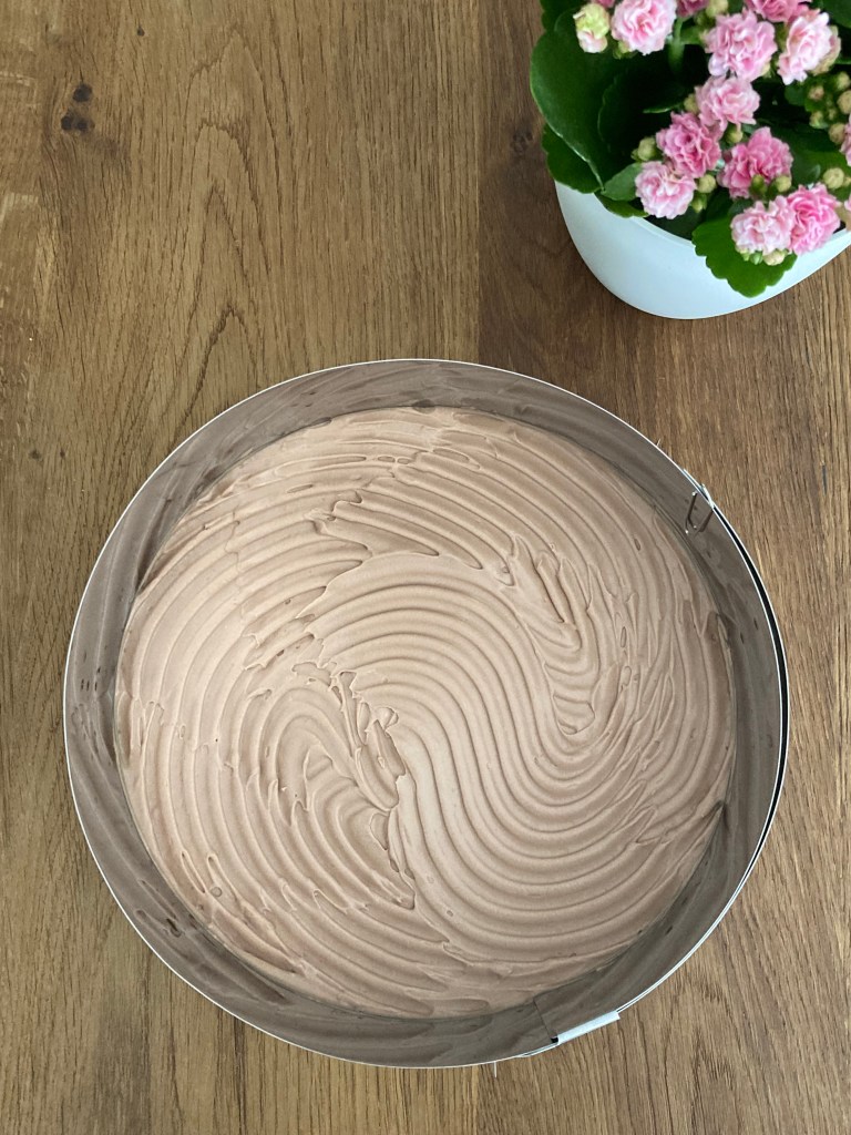 Die Rosegota auf einen großen Kuchenteller geben und einen (flexiblen) Tortenring darum herumlegen. Den ausgekühlten Kaffee gleichmäßig darüber träufeln.