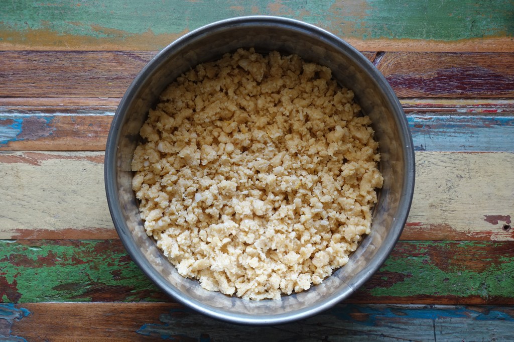 In der Bezeichnung Sbrisolona steckt das mantovanische Wort brìsa (Brösel, Krümel): Bei der Herstellung werden die Zutaten nämlich mit den Fingern zu einem krümeligen Teig verarbeitet. Die Teigkrümel werden dann (relativ) locker in eine runde Form gegeben und zu einem großen, knusprigen Keks gebacken.