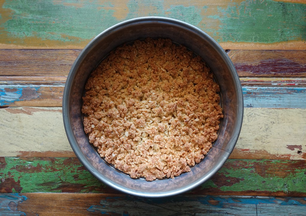 Alle Zutaten in eine Schüssel geben und „abbröseln“ (mit den Fingern zu einem krümeligen Teig verarbeiten). Die Teigkrümel in die mit Backpapier ausgelegte Form geben (nur ganz sanft festdrücken!). Übrigens: Wer die Rosegota nicht als Tortenbasis verwendet, der kann sie zusätzlich noch mit ein paar ganzen Mandeln dekorieren.