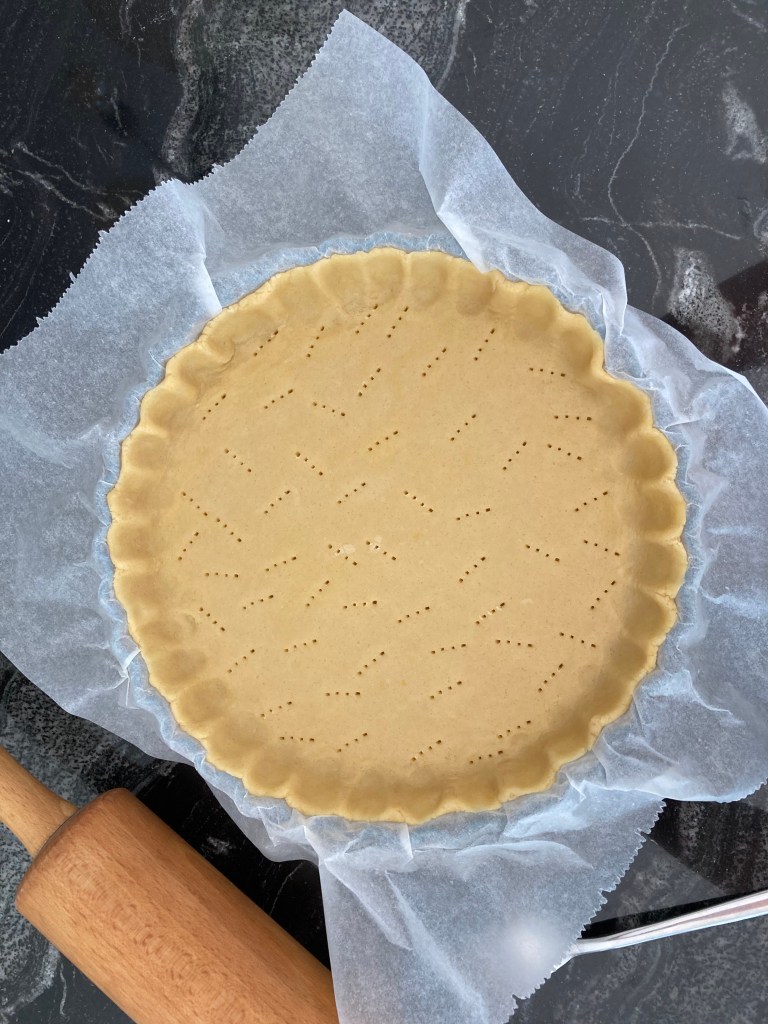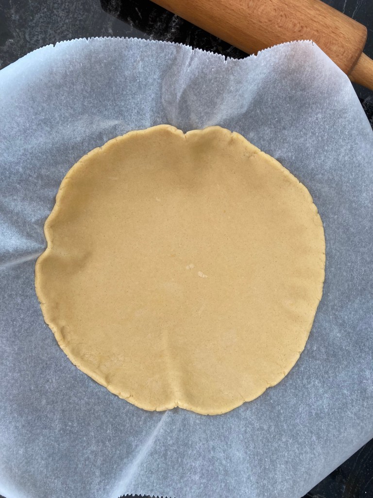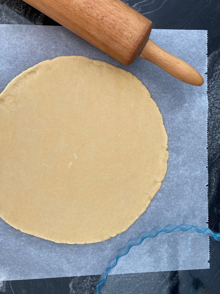 Ca. 2/3 des Teiges auf Backpapier kreisrund ausrollen (etwas größer als die Form, so entsteht ein Rand) und (mit dem Backpapier!) in die Backform legen und – besonders an den Rändern – sanft festdrücken.
