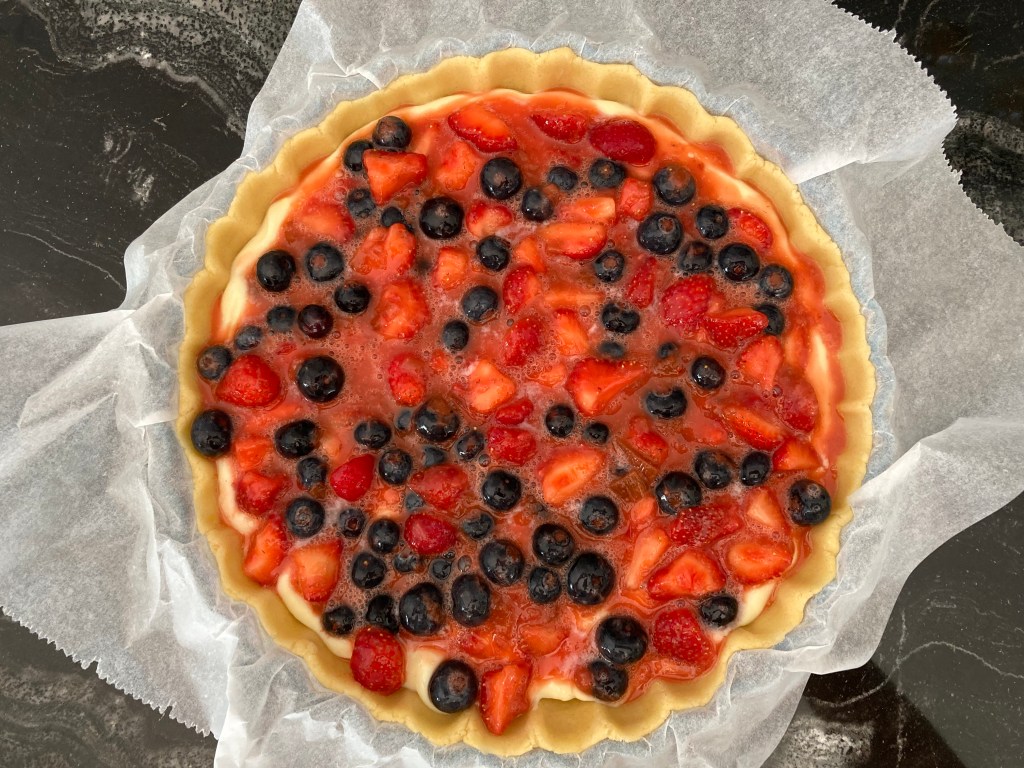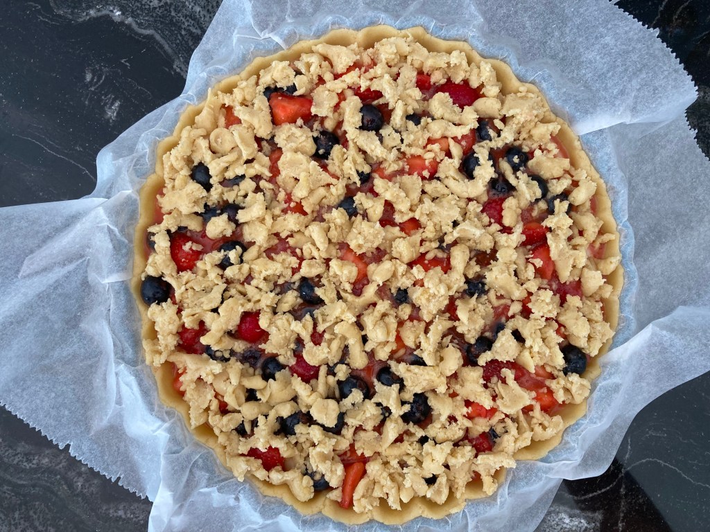Den Teig mit einer Gabel mehrmals einstechen. Die überkühlte Crema pasticcera mit dem Schneebesen glattrühren und auf dem Boden verteilen. Die Beeren (Erdbeeren in kleine Stücke schneiden, die Heidelbeeren ganz lassen) mit Marmelade und Maisstärke vermischen und auf die Creme-Schicht geben. Den restlichen Teig mit den Fingern zerkrümeln und gleichmäßig auf der Füllung verteilen.