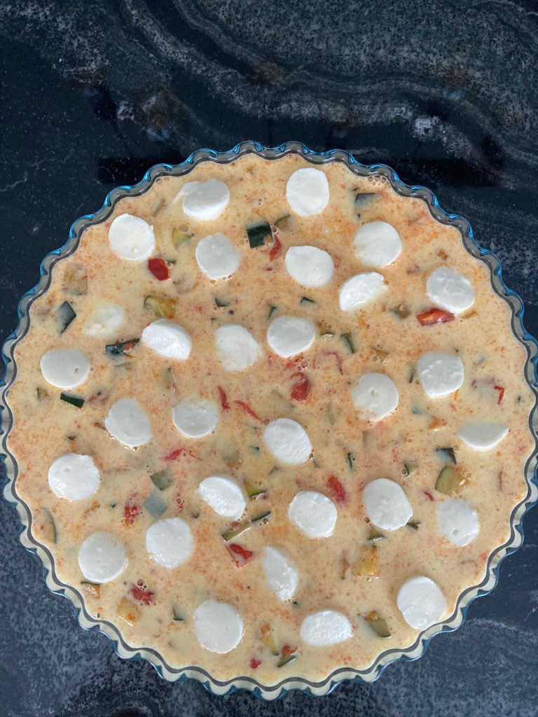 Das Gemüse in der Form verteilen, das Milch-Obers-Ei-Gemisch darüber gießen und mit Mozzarella-Stücken belegen.