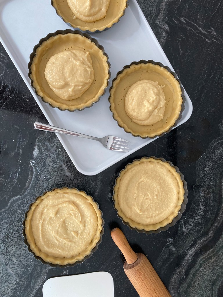 Die Formen aus dem Kühlschrank nehmen, die Teigböden mit einer Gabel mehrmals einstechen, die Mandelcreme einfüllen und glattstreichen.