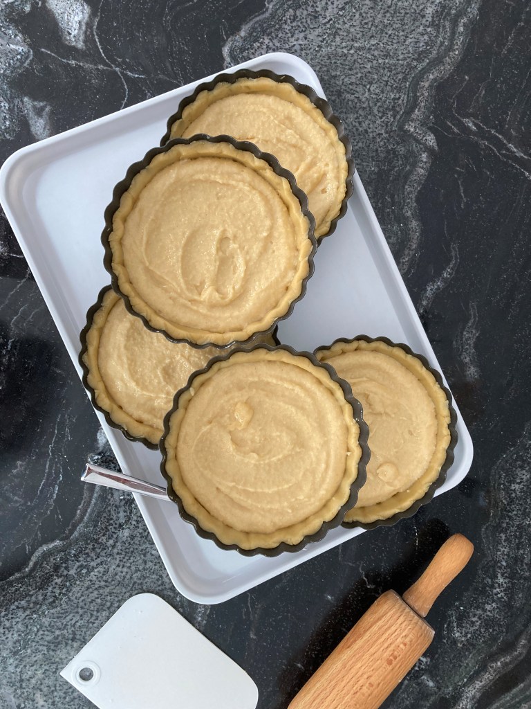 Die trockenen Zutaten mit der kalten Butter „abbröseln“ (mit den Fingern verreiben), dann das Eigelb und das Wasser rasch unterkneten. Sobald der Teig glatt ist, diesen in 5 gleich große Stücke teilen. Jedes Teigstück kreisrund (und etwas größer als die Form) ausrollen. Dieses dann in die Formen legen und an den Rändern jeweils hochziehen. Die Formen für ca. 30 Minuten in den Kühlschrank stellen.