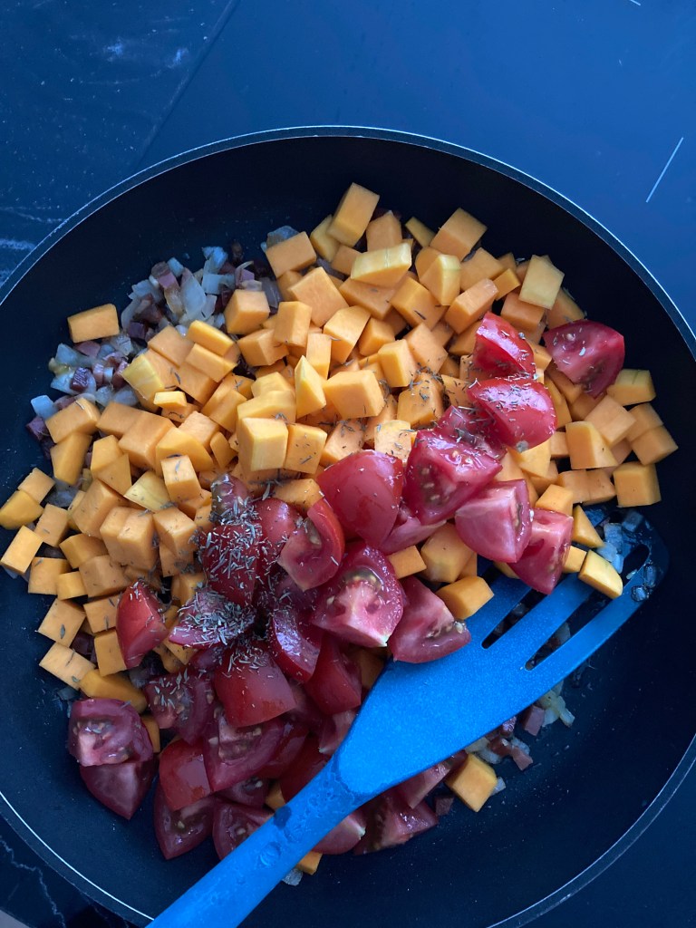 In einer großen (Anti-Haft)Pfanne das Öl erhitzen und die Speck- sowie die Zwiebel – und Knoblauchwürfel darin langsam glasig dünsten. Die Kürbis- und die Tomatenwürfel hinzufügen, gut anbraten, dann salzen und mit Thymian würzen. Für ca. 15 Minuten (ohne Deckel) dünsten lassen.
