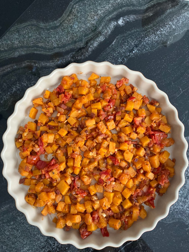 Was mit Zucchini geht, das geht auch mit Kürbis, dachte ich mir, außerdem gab es da noch ein paar Speckwürfel im Kühlschrank, die wegmussten … und mit Zwiebeln kann man sowieso nichts falsch machen, Mozzarella wollte ich nicht extra kaufen, also habe ich ihn weggelassen, die Tomaten aber nicht. Und der Rest?? Der ist geblieben wie in diesem Rezept hier (klick!) beschrieben 😊!