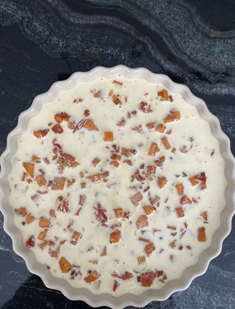 Das Gemüse in der Form verteilen und das Milch-Obers-Ei-Gemisch darüber gießen.