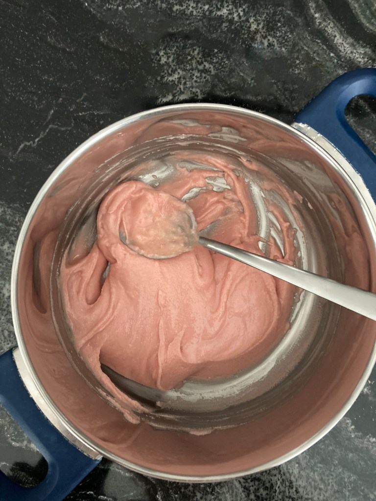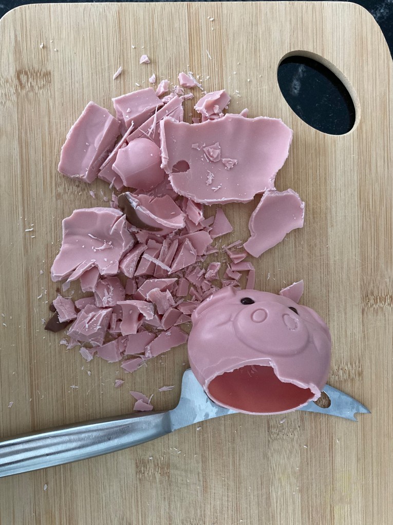 - 150 g weiße Schokolade (hier: 1 rosa Glücksschweinchen 💗), grob gehackt