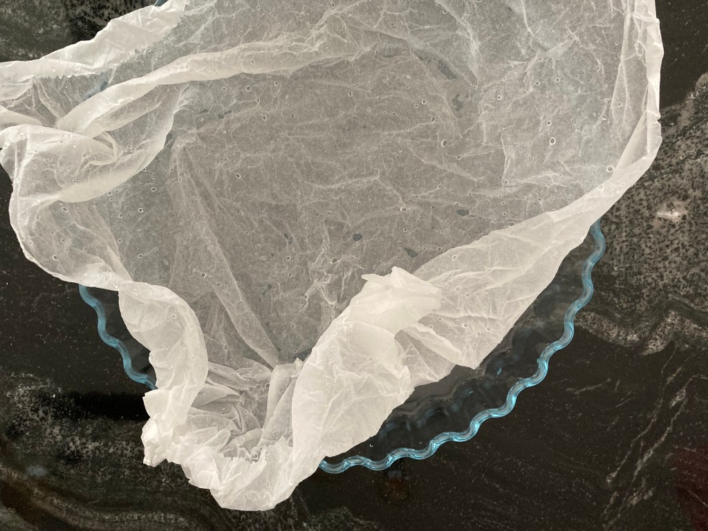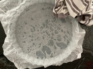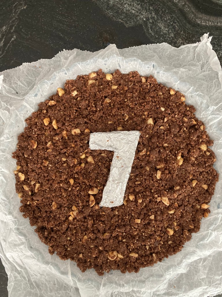 Den Bogen Backpapier unter fließendes Wasser halten, dann auswringen und die Tarteform damit auslegen (so schmiegt sich das Papier an die Form und verrutscht nicht). Etwaige Wassertropfen mit einem Küchentuch behutsam entfernen. Die Zahlenschablone rundherum mit Öl einpinseln und mittig in die Form legen. Dann die Teigkrümel einfüllen (dabei die Schablone festhalten, damit sie nicht verrutscht) und sanft festdrücken. Zum Schluss mit ein paar ganzen Haselnüssen dekorieren.