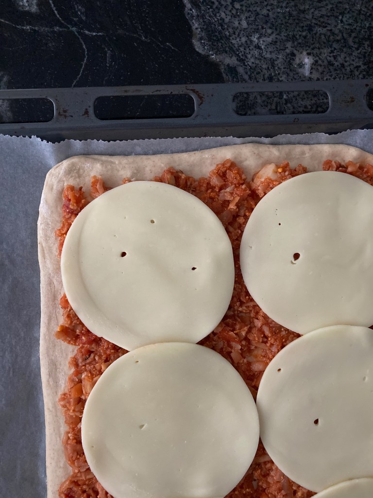 Die Karfiol-Bolognese mit dem Parmesan verrühren und auf dem Pizzateigboden verteilen. Mit dem Käse belegen und den Blätterteig darüberlegen. Die Ränder des Blätterteiges vorsichtig unter den Hefeteig schieben.