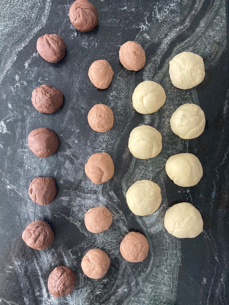 Den Teig halbieren. Eine Hälfte bleibt hell, die andere wird in 2 gleich große Stücke geteilt: Ein Stück davon wird mit 4 TL Kakao + 2 EL Milch dunkelbraun, das andere mit 1 TL Kakao + 1 EL Milch hellbraun eingefärbt.