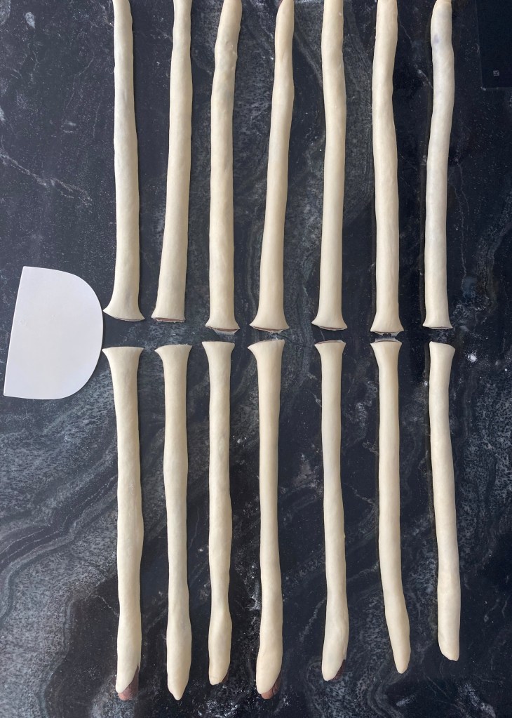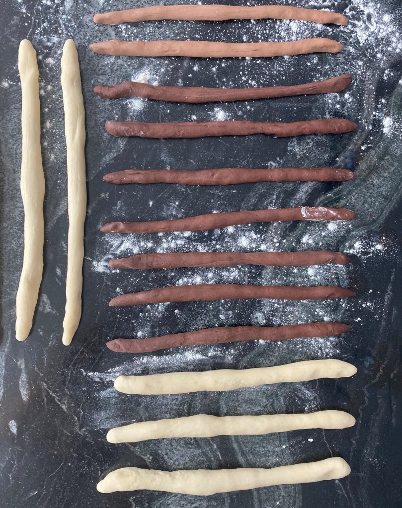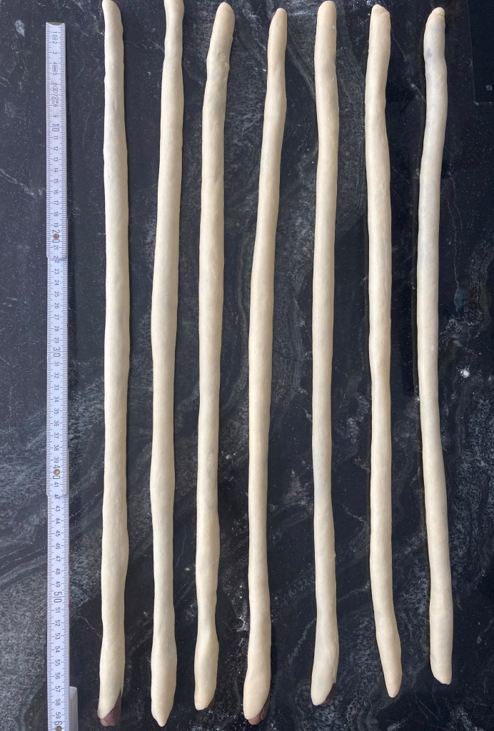 Danach jedes Teigstück in jeweils 7 gleich große Portionen teilen. Jede Portion zu ca. 30 cm langen Schlangen rollen.