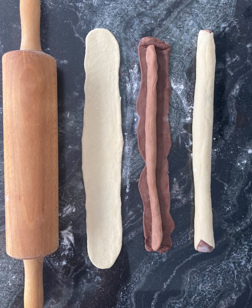 Die dunkelbraunen Schlangen ca. 4 cm breit ausrollen (oder mit den Fingern einfach etwas plattdrücken 😉). Die hellbraunen Schlangen darauflegen und einrollen.