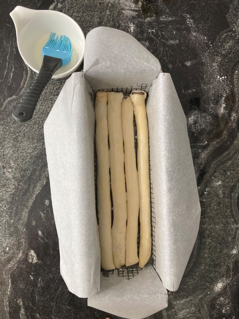 Diese legt man locker in die vorbereitete Kastenform. Jede Lage bitte mit etwas Milch bepinseln! Dann zudecken und nochmals ca. 30 Minuten lang gehen lassen. Anschließend in den vorgeheizten Ofen (180°C, Ober-/Unterhitze) stellen und für ca. 35-40 Minuten goldbraun backen.